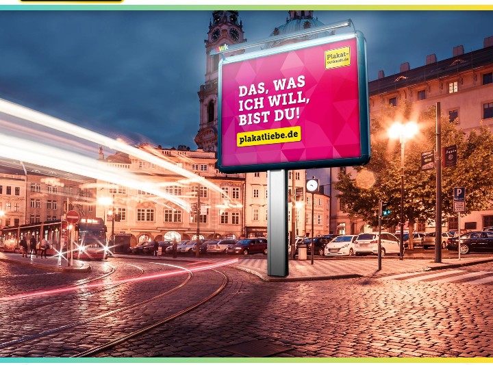 Neulich kam ich von einer Fahrt zurück nach Hause und fuhr von einer anderen als der üblichen Richtung in die Stadt. Da sah ich an einer Hauswand ein Werbeplakat kleben, Hintergrund magenta, aber die Schrift war nicht die des Telefongeschäfts, und es stand drauf: das was ich will, bist du!