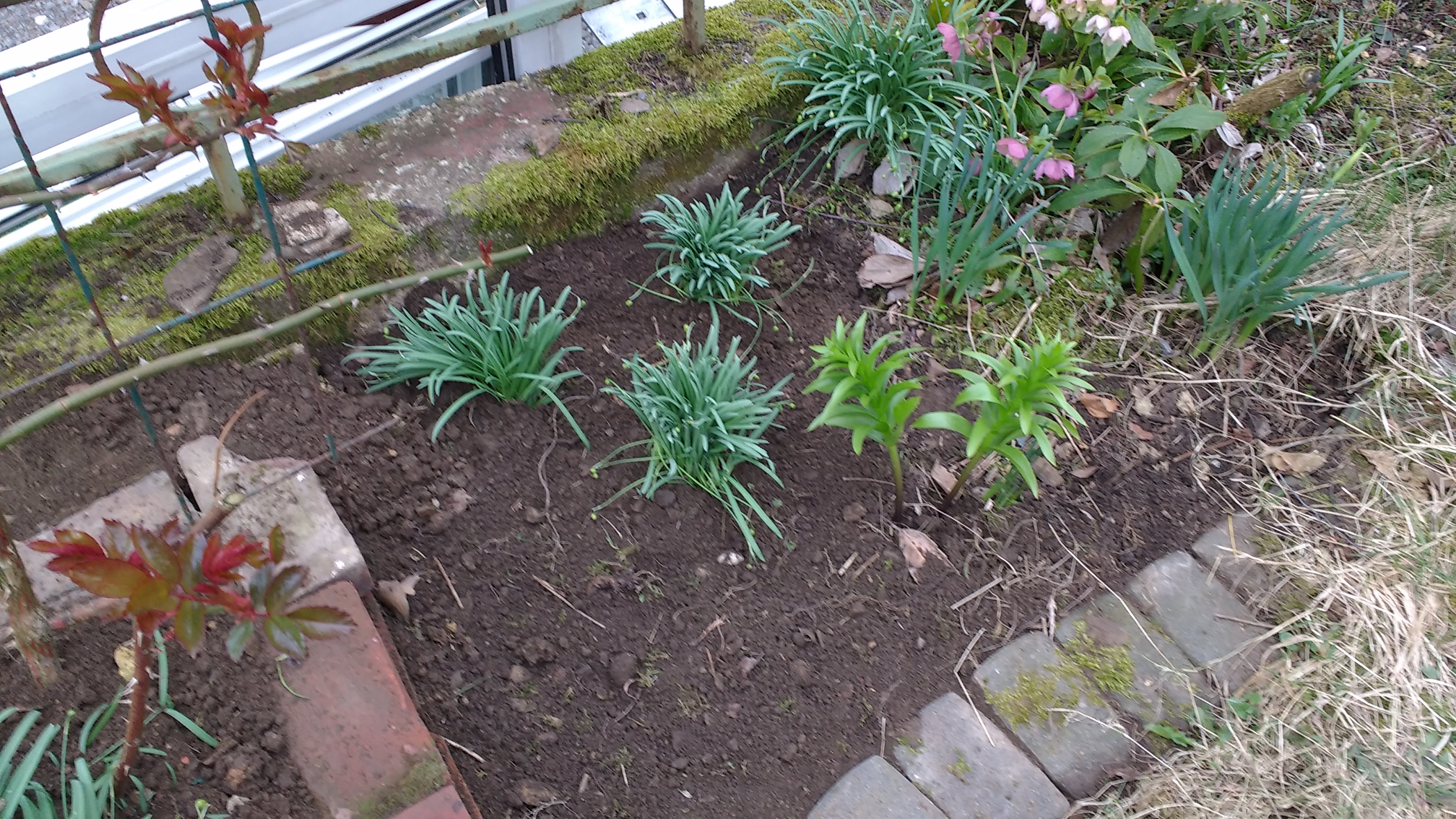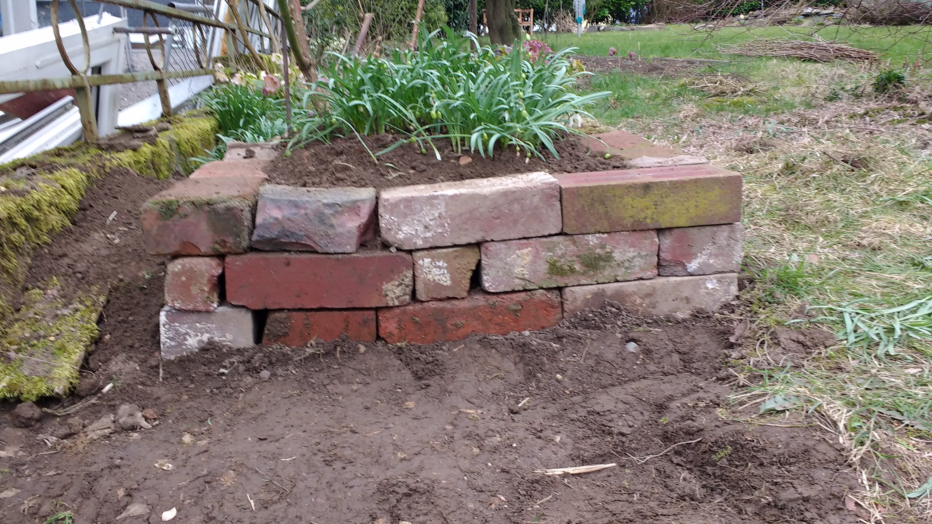 Aus Gründen des Bremsweges habe ich sie schließlich aus dem Kofferraum genommen und angefangen, den Rosenkasten im Stein-Stilmix vorsichtig abzubrechen, damit die Herde der Schneeglöckchen nicht in Unruhe gerät. Schneeglöckchen sind nicht gern alleine, das merkst du sofort, wenn du welche siehst. Aber sie sind leicht in Aufruhr zu bringen, erschrick sie bitte nicht.