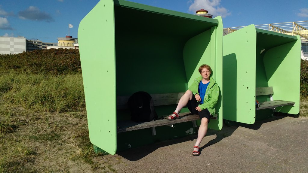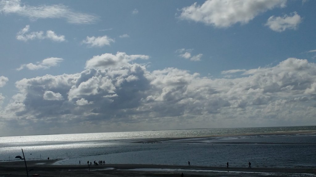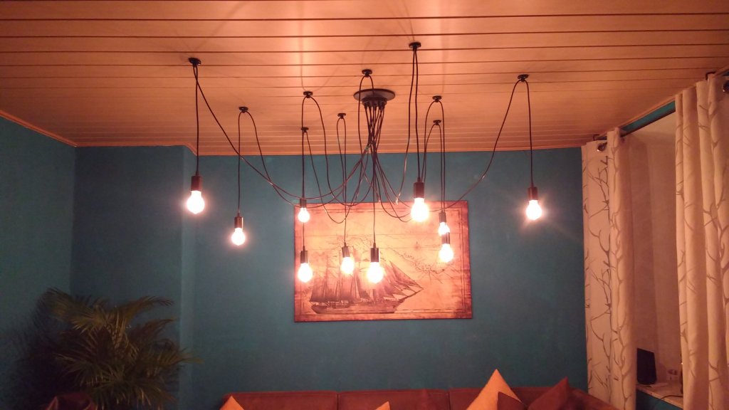 Diese spezielle Lampe hängt in dem Wohnzimmer, das ich während meines Urlaubs bewohnen durfte. Das Zimmer ist von oben bis unten und an allen Wänden dunkel-petrol gestrichen, was du siehst, ist also keine Fehlfarbe, die das Handy eingefügt hat. Der Wohnzimmerhauptbewohner hatte nach zehn Jahren mit Saisonarbeitsverträgen zwischen lauter weißen Wänden Bock auf Farbe. Zum Glück hat der Raum zwei große Fenster, sonst käme man sich wohl vor wie in einem Schuhkarton.Ich habe mein Handy noch immer nicht mit einer integrierten Wasserwaage optimiert, das sieht man prima an diesem Foto. Ich nenne das Problem Horizontitis, was absichtlich nach einer Krankheit klingt. Halte deinen Bildschirm bitte entsprechend schief, sonst läuft ja das ganze Meer aus.Ich liebe es, wenn das Licht grell und hart wie aus einem Schacht auf die Wasserfläche trifft und alles drumherum dunkel liegt. Es war das erste der Art, das mir im Urlaub gelungen ist. Zum wirklich guten Foto müsste noch mehr Ordnung am Himmel herrschen (nicht so ein Wolken- und Helligkeitsdurcheinander).Schäfchenwolken, pöh! Hier siehst du, sehr zentral und grau hervorgehoben, eine Schildkrötenwolke. Das einzige Panoramafoto, das etwas geworden ist. Die anderen sind beim Rendern abgestürzt, vielleicht war zu wenig Platz auf der SD-Karte. Hier erkennst du besonders eindrücklich die Erdkrümmung. (Das Foto ist nicht an Horizontitis erkrankt: die äußert sich nur schräg und nicht leicht wellig.) Bereits zu dem Zeitpunkt (erster kompletter Urlaubstag auf der Insel) wusste ich, dass alles im grünen Bereich ist. Das bin nämlich ich: so sehe ich aus. Das gleißend Weiße sind übrigens meine Füße, die bis dahin kaum einen Sonnenstrahl abbekommen hatten. Eingedenk der Tatsache hatte ich sie kurz zuvor mit Sonnencreme eingeschmiert, sodass sie sogar leicht bläulich wirkten.
