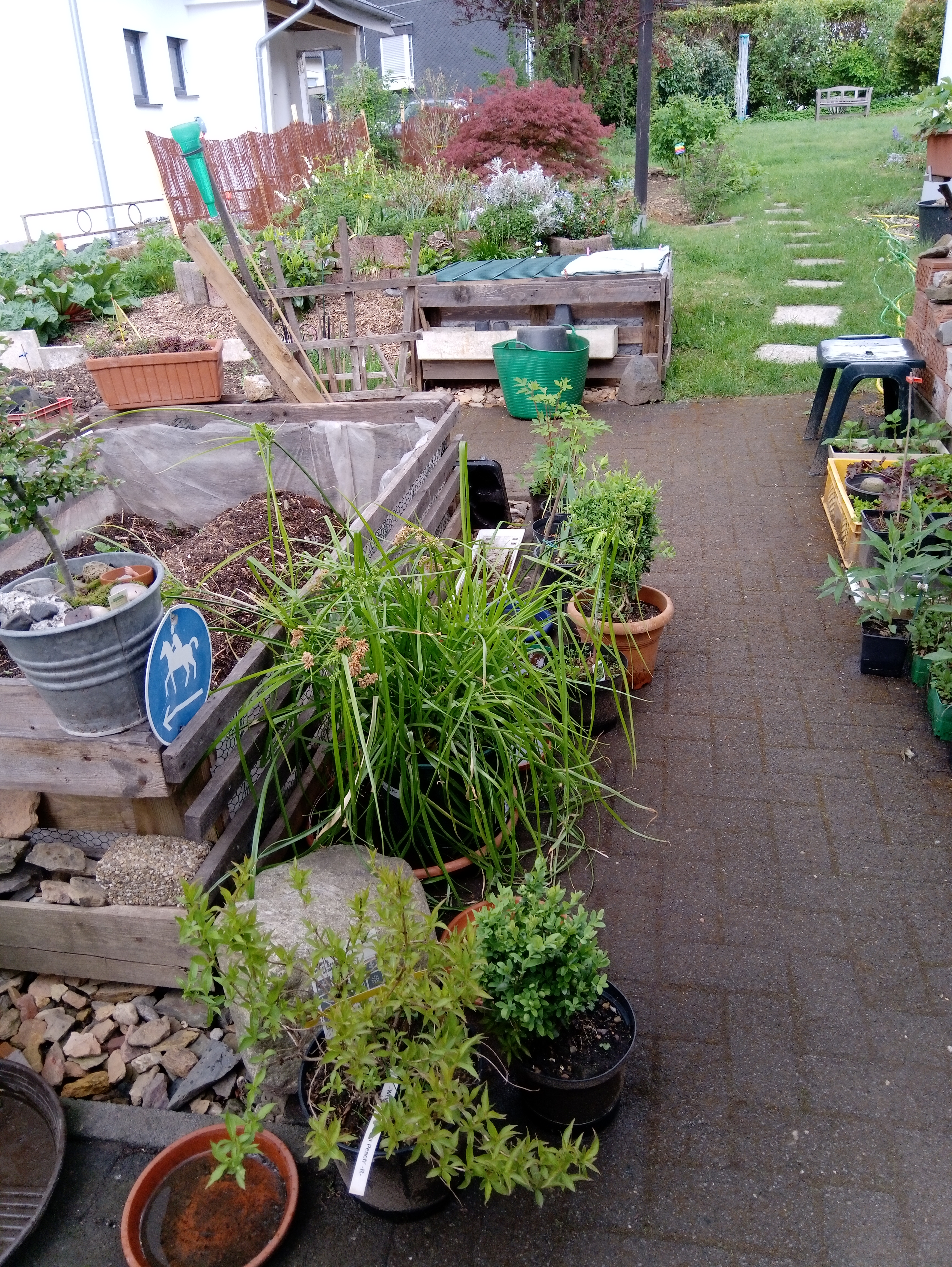 Als ich das nächste Mal in meinem Garten war, wusste ich es wieder: weil in meinem Garten fast jedes Jahr umgeräumt wird. Alles rotiert – na ja, bis auf die Hochbeete und das Foliengewächshaus. Jedes Jahr ist es wieder spannend, wie aus dem Bauhof mit lauter Kübeln als Zwischenlager für alles, was woanders hin soll, Steinstapeln und Erdhaufen (Mitte März harkte ich noch liebevoll meine Kieselsteinsammlung*) ein hübscher Nutz- und Ziergarten wird. Deswegen ist bei mir ganzjährig Gartensaison, außer Schnee und Eis verhindern Erdbewegungen.