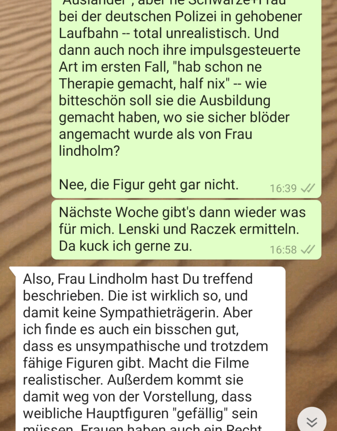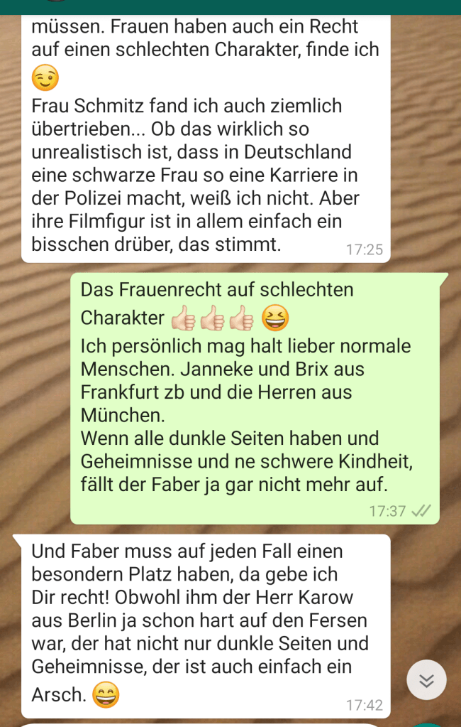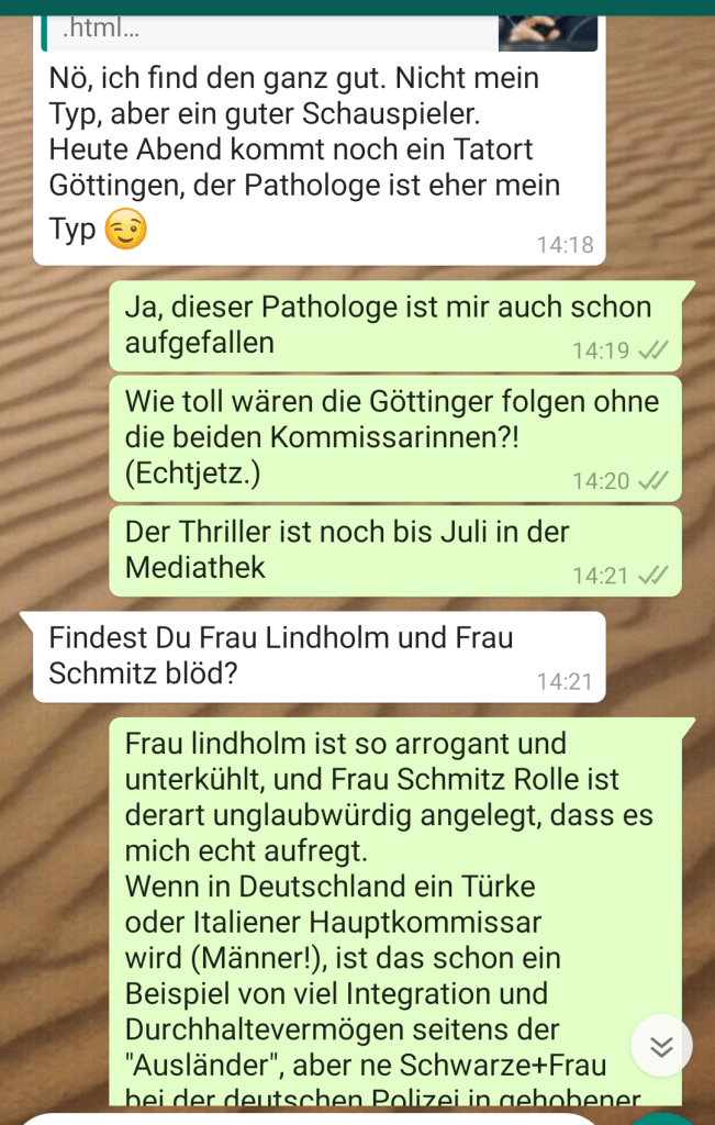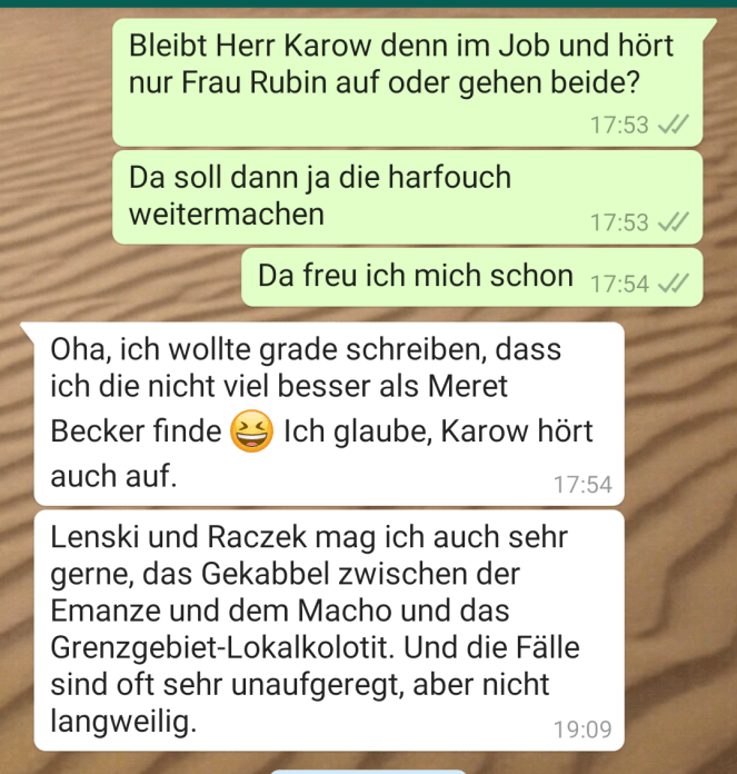 Dieses mehrteilige Chatprotoköllchen zweier Tatort- und Polizeiruf-Fans wollte ich dir nicht vorenthalten.