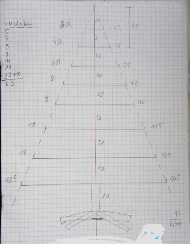 Nein, erst noch ein wichtiger Hinweis. Wir bauen für einen sehr großen Saal und planen mit einer Baumhöhe von 2,5-3m. Wenn du für eine Kleinfamilie auf 100qm Wohnfläche (o.ä.) baust, brauchst du logischerweise von allem ein bisschen weniger.