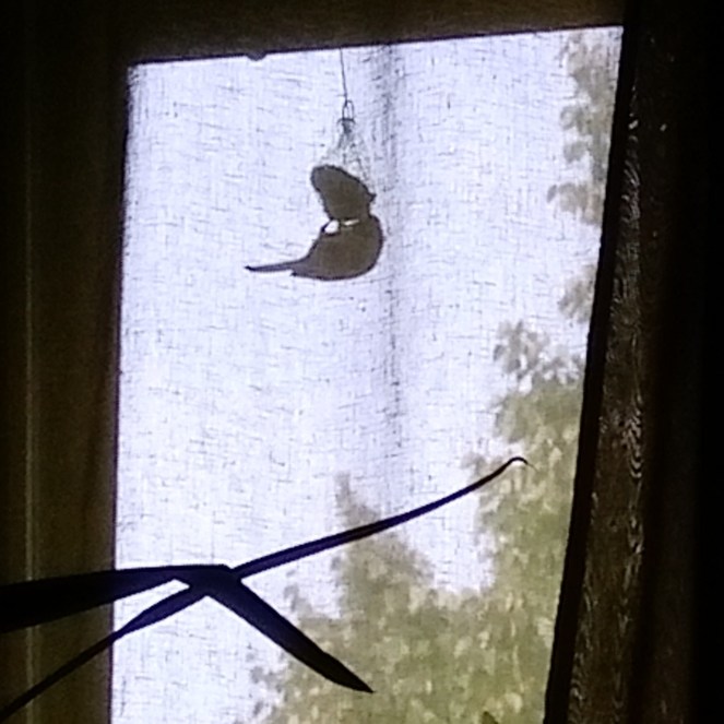 Neulich war das Säckchen vom Knödel unten aufgegangen und der Inhalt -plonk!- abgestürzt, das war großes Theater. Wo ist unser Knödel?, schienen sie immer zu fragen, wenn sie angeschwirrt kamen und nur den leeren Beutel vorfanden. Ich konnte das Malheur zum Glück beheben.
