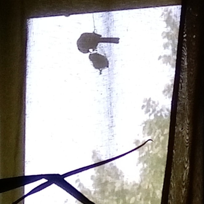„Meine“ Wildtiere sind eine ungewisse Anzahl von Meisen, die vor meinem Schlafzimmerfenster herumtoben, denn da hängt ein Futterknödel. So betreibe ich meinen Anteil am Artenschutz. (Auch im Garten wird ganzjährig zugefüttert.) Die Meisen sind sehr kluge Vögelchen, die genau wissen, ob ich Fotos von ihnen machen will. Dann sind sie nämlich nie zu sehen. Nur manchmal habe ich eine Schongs sie zu erwischen: wenn ich im Bett liege, ist meine Anwesenheit wohl nicht mehr zu spüren. Und die Gardine ist von hell zu dunkel blickdicht.