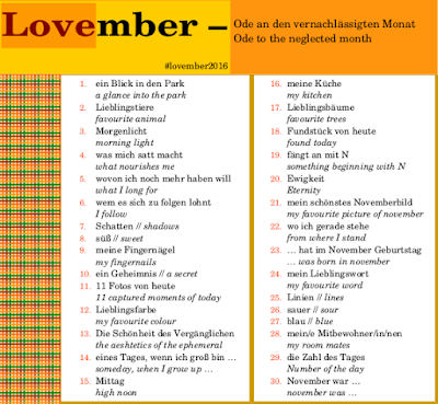 Deshalb will ich dem November wieder ein Denkmal setzen und die LOVEmber-Aktion erneut durchführen. Du bist herzlich eingeladen mitzumachen. Ich habe die Inspirationshilfe von 2016 gründlich überarbeitet, fast die Hälfte der Punkte ist neu.