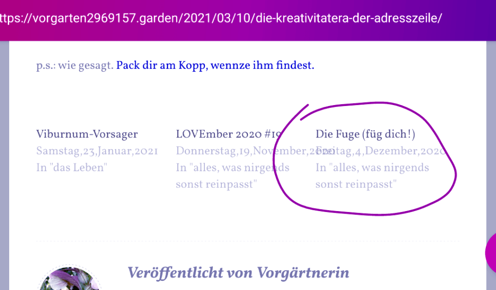 1. Pingback: Die Kreativitäterä der Adresszeile | willkommen im sichtbaren Teil des Vorgartens meines Gehirns
