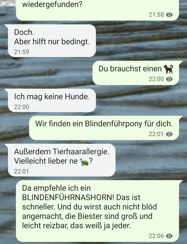 Ich konzentriere mich weiter auf die Ausbildung der Blindenführnashörner. ….. Das war nämlich so, vor einiger Zeit: