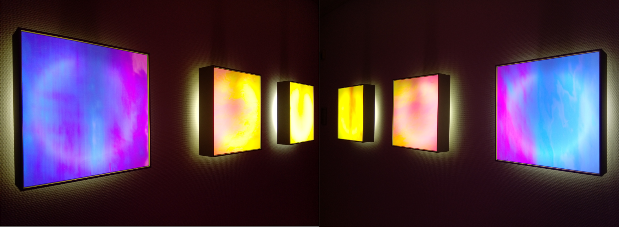 - hier hängen in den Fluren seltsame Lampen rum … von vorne betrachtet sind sie gelb, nähert man sich von der Seite – na, siehste ja. Ich habe zwei Fotos zusammengesetzt, der Strich in der Mitte zeugt davon.