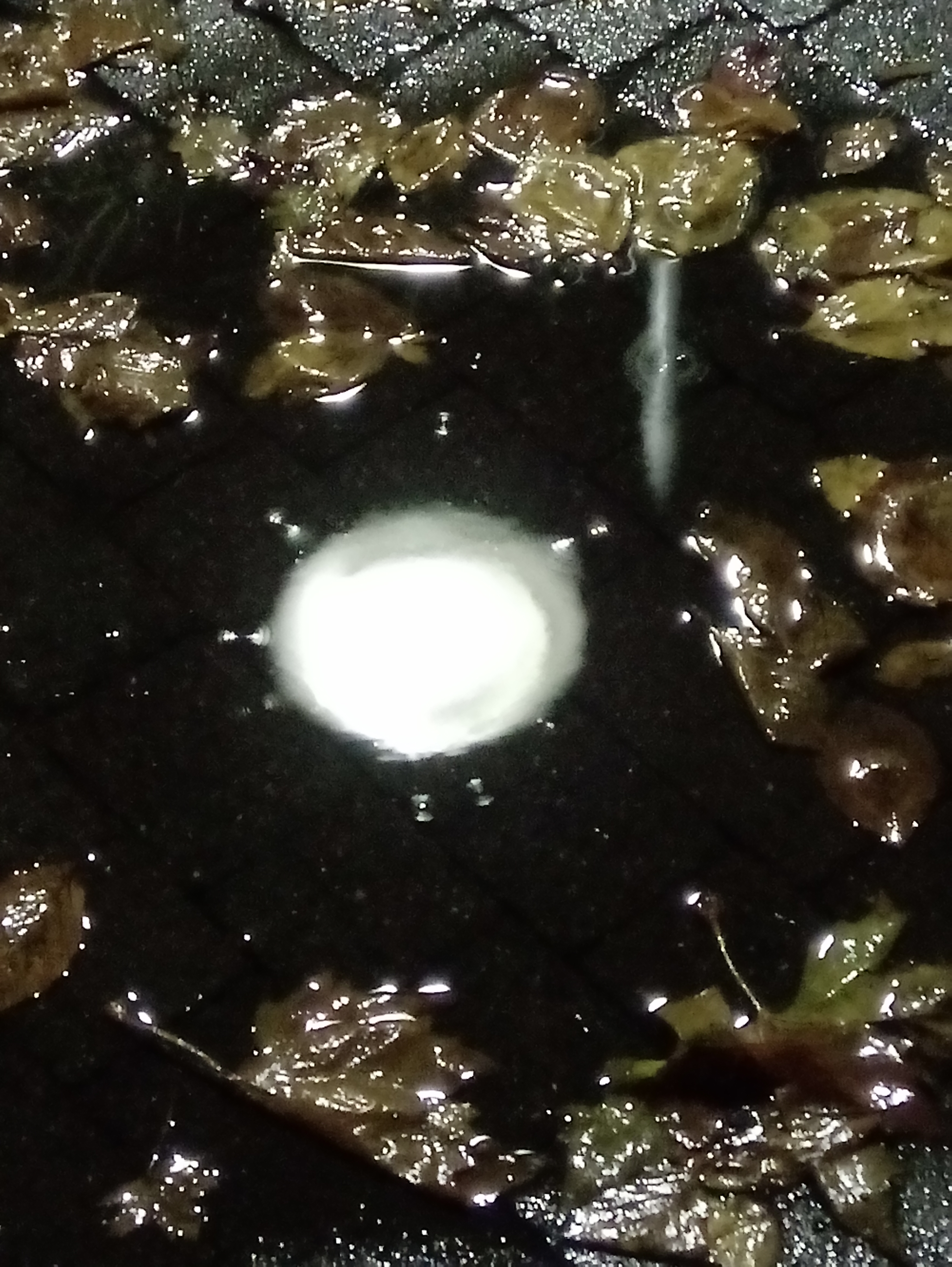 - Eine Pfütze bei Dunkelheit und Regen, in der sich die Straßenlaterne spiegelt