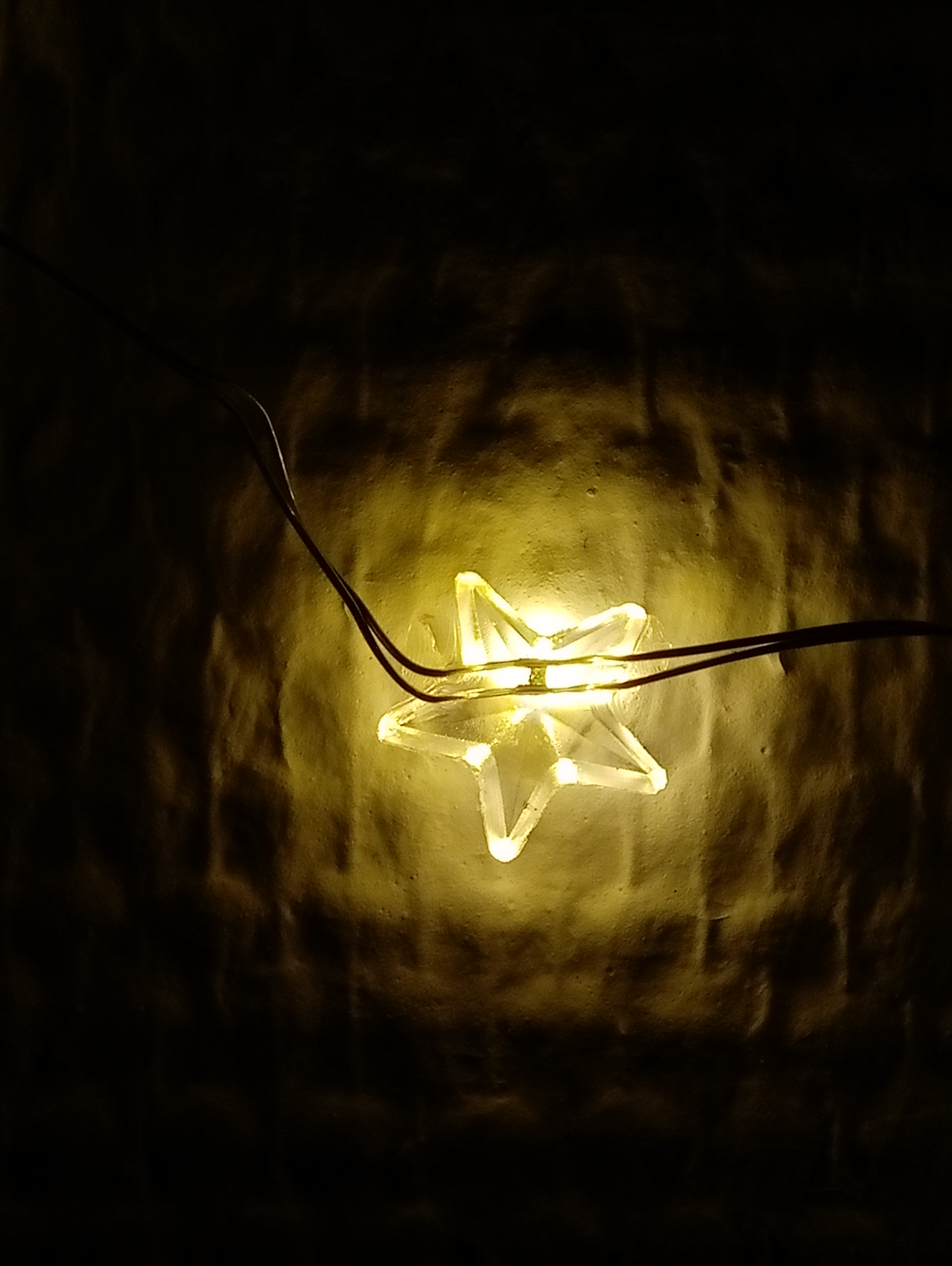 - Eins der daumennagelgroßen* Sternchen meiner neuesten Lichterkette, dahinter das Strukturpapier der Tapete (* = gemessen an meinem Daumen)