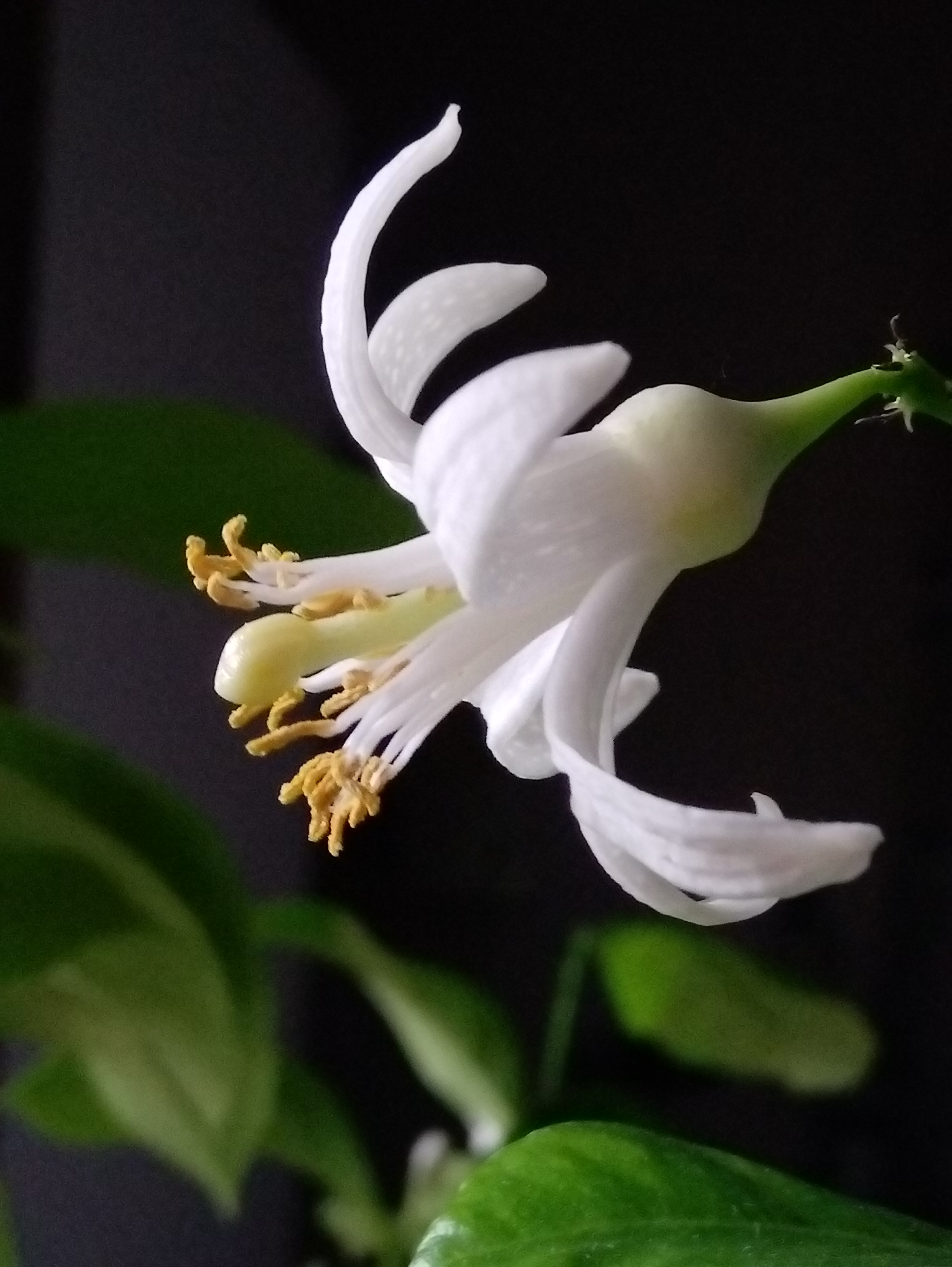 - Eine Zitronenblüte vor dunklem Hintergrunz
