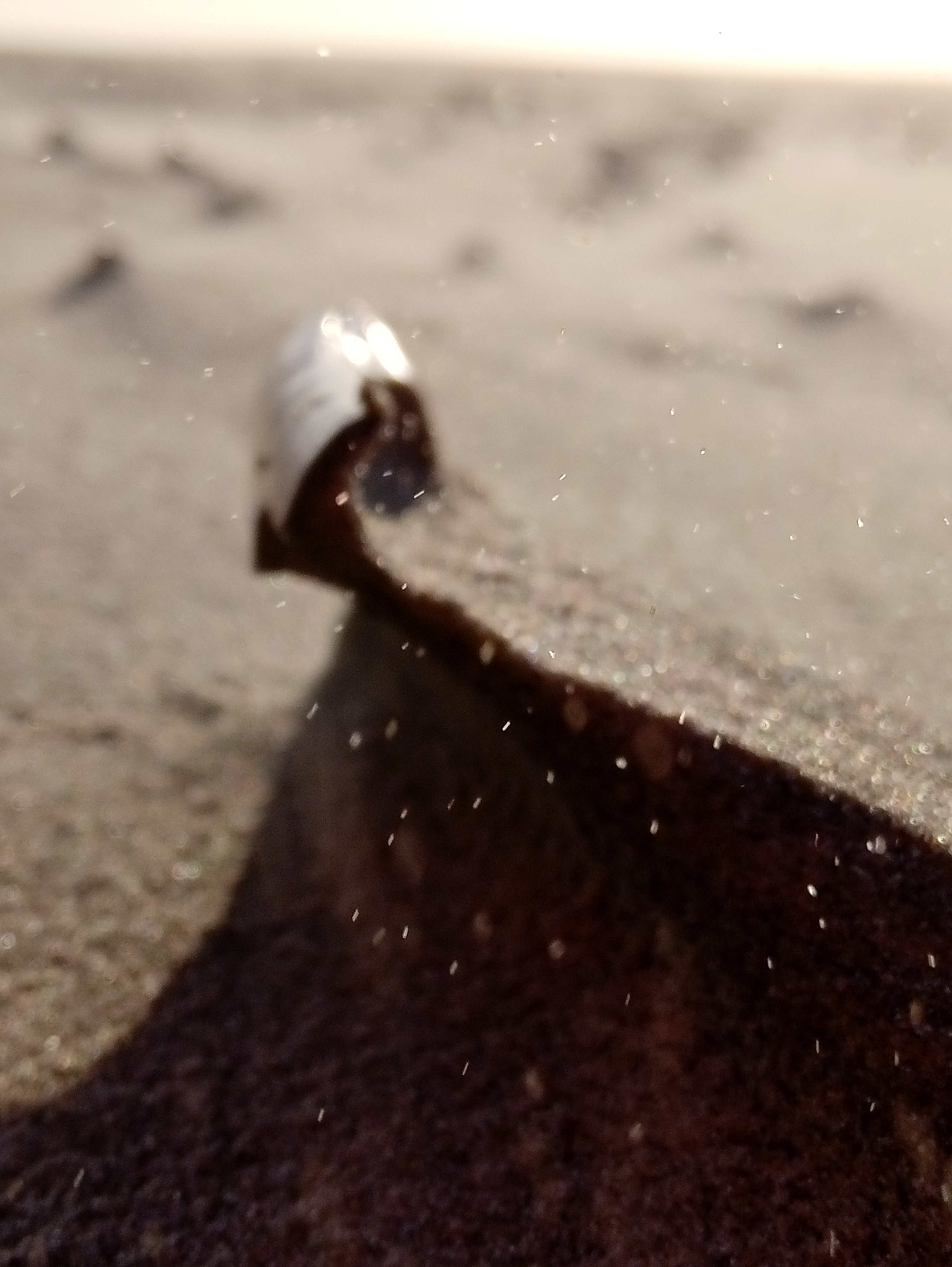 - Eine Muschel auf ihrem Sandhäuflein, bei Gegenwind, Gegenlicht und fliegendem Sand – ein echter Zufallstreffer