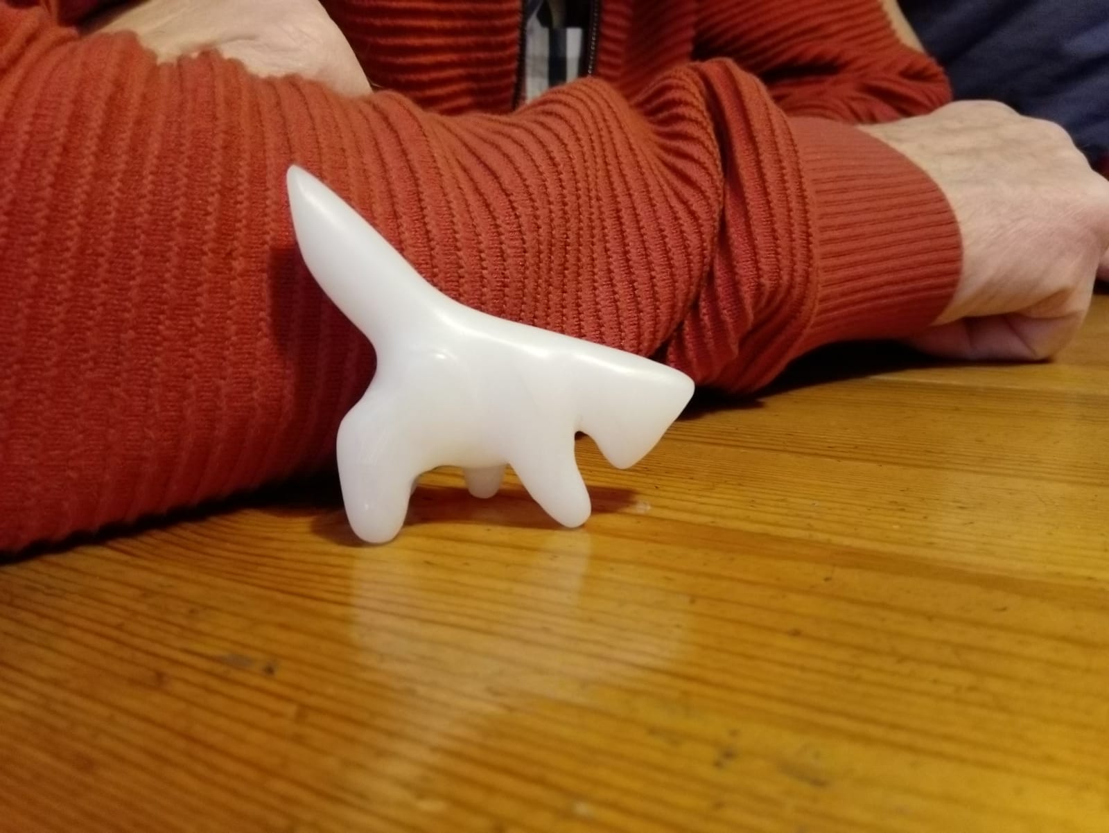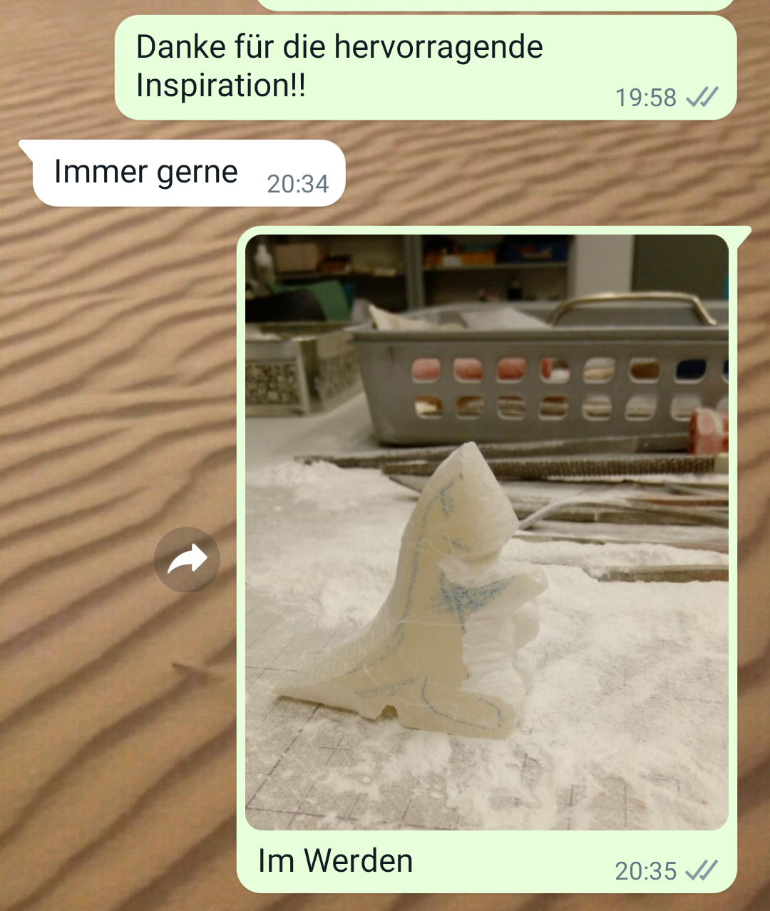 Kurz darauf (ich war zwischenzeitlich in der leeren Ergowerkstatt angekommen und hatte mein Specksteingedöns ausgebreitet) entspann sich folgender Dialog: