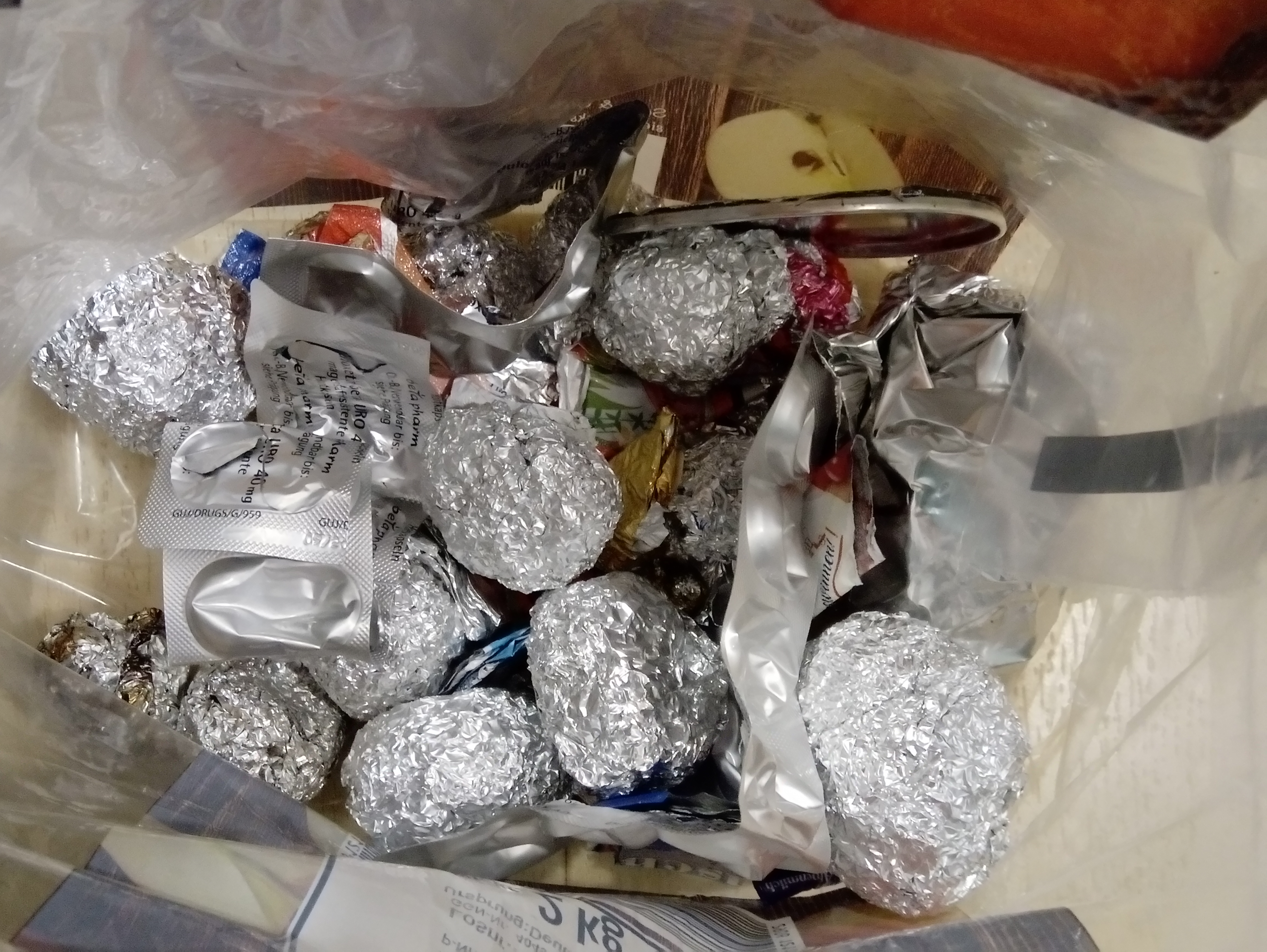 Ich habe in der heimischen Küche ein Gefäß, in das ich das anfallende Alu sortiere. Im Keller steht der große Sack (neben dem Eimer für Stahl, dem Tütchen für Kupfer, …). Das sind Strukturen, die in jedem Haushalt Platz finden, und wenn nicht, machst du dir halt eigene Strukturen. Hier in der Reha sammle ich natürlich auch, und erkläre den Mitmenschen gerne, was ich mit der Alufolie von ihrem Döner vorhabe.