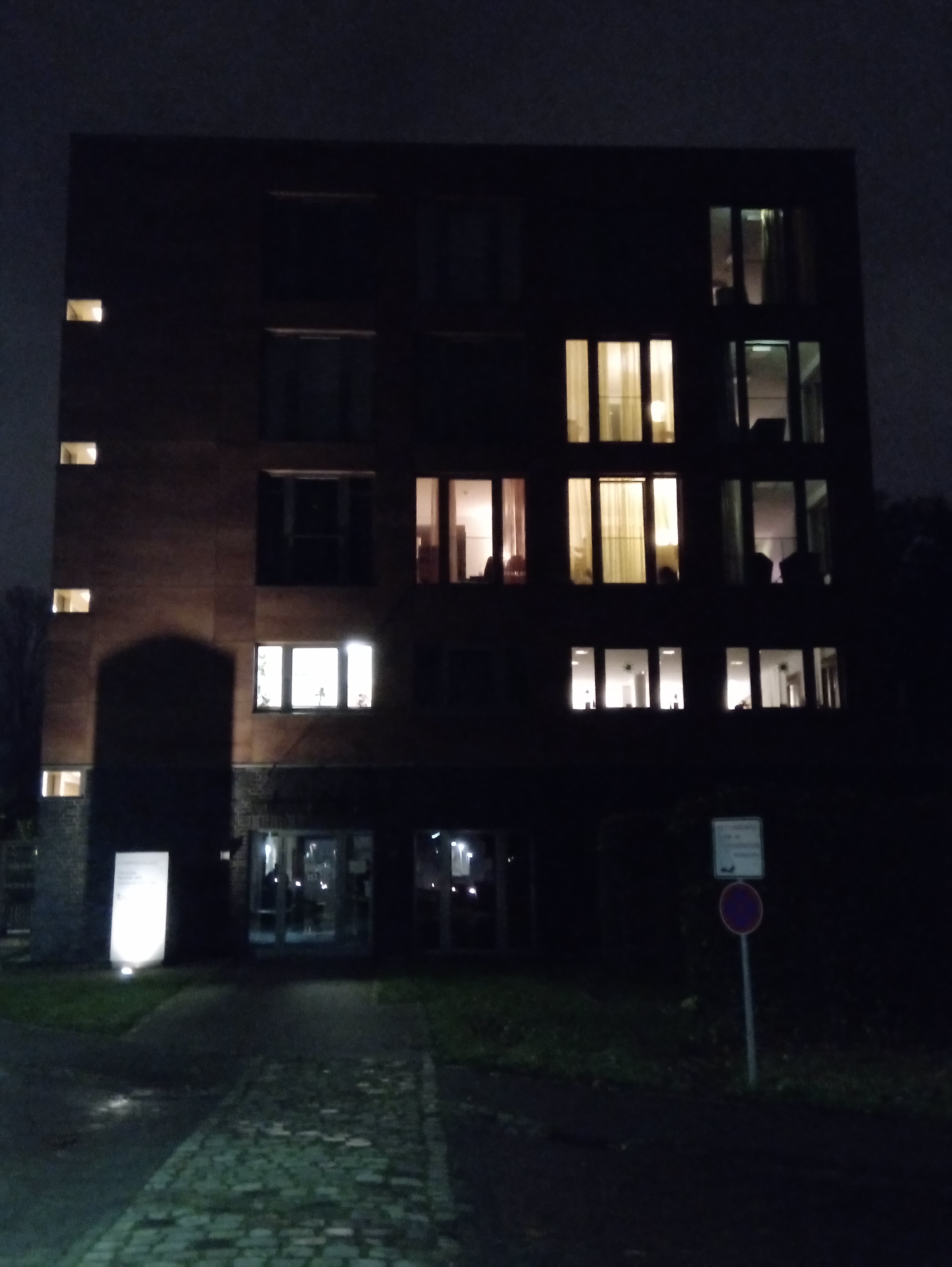 - geordnetes Licht in unserer Reha – bis auf das eine Bürofenster. Hinterm ersten Fenster von links im zweiten Stock hab ich gewohnt
