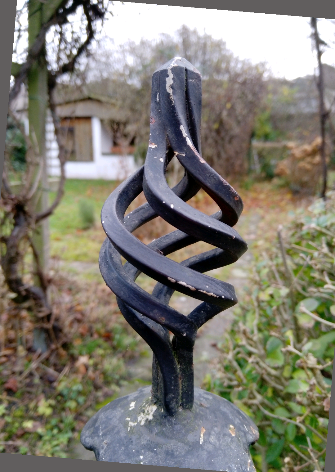 - Ein schmiedeeiserner Schnörkel am Gartentörchen in der Kleingartenkolonie, in der auch mein sog. Aushilfsgarten war. Es ist eine Parzelle, die die Reha gepachtet hat, um ihren zwei Bienenvölkern eine Heimat zu geben. An den grauen Ecken des Fotos siehst du, dass es ursprüngli gefährli schief war