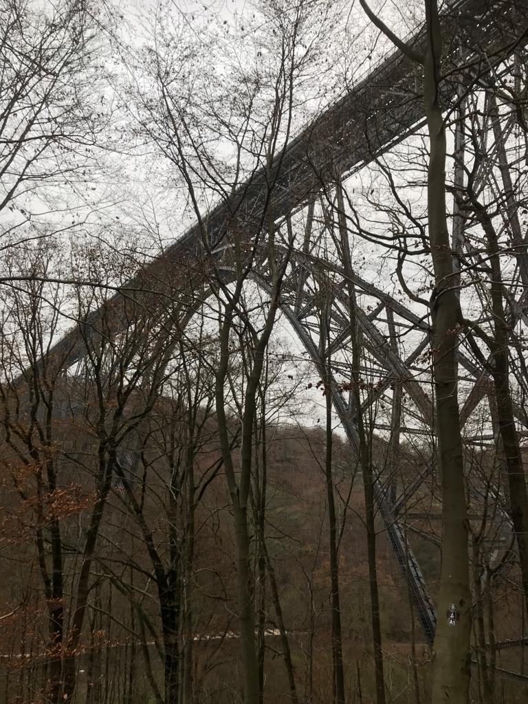 - zu guter Letzt noch drei Fotos von der schönsten Brücke des Bergischen Landes und der seit ihrer Fertigstellung im Jahr 1897 höchsten Eisenbahnbrücke Deutschlands: die Müngstener Brücke, die wie geschaffen ist für eine Abhandlung über Formen und Linien. Das dritte Foto zeigt nicht sie, sondern den Anblick von oben, aus dem heimfahrenden Zug heraus, damit der Ortsunkundige sich ungefähr vorstellen kann, wie hoch sie ist.