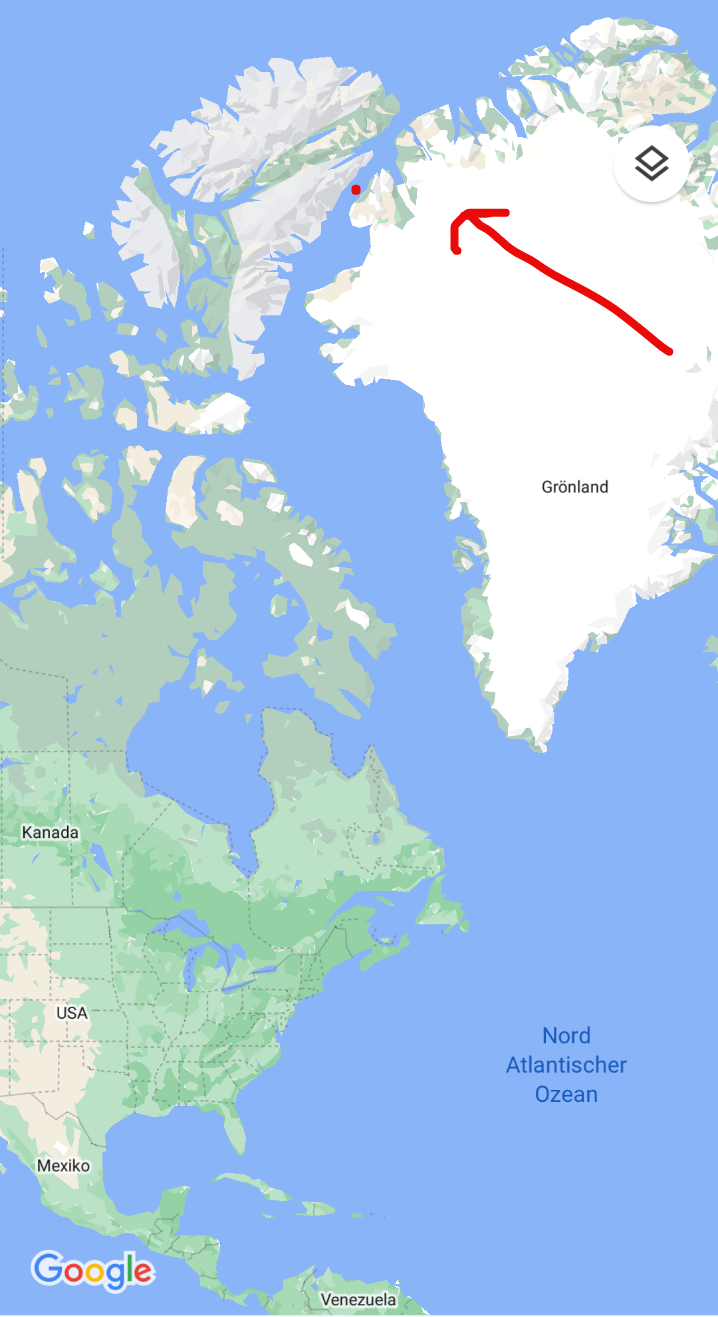 rechts: Der Stein des Anstoßes, von Grönland (Dänemark) aus betrachtet. Weiter hinten Ellesmere (Kanada). Bildschirmfoto aus Tante Wikis großem Lexikon.