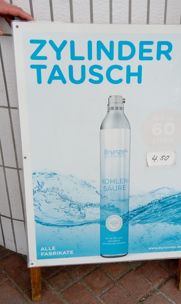 Ich hab den Mann gefragt, an dessen Gschäft das Schild stand (es ist seine Hand da oben, er wollte es gerade von der Straße holen und dann seinen Laden zusperren), aber er verstand die Frage nicht. Er erklärte wiederholt, dass es ja um Sodastreamer ginge.