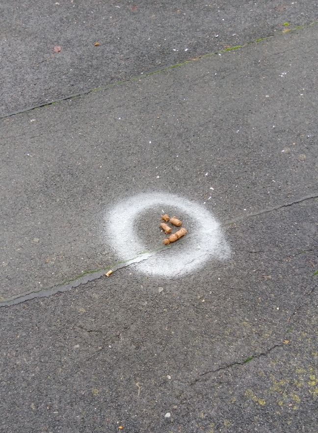 Also gut: Der Mensch hat seinen Hund auf den Bürgersteig kacken lassen und es nicht weggemacht und dann habe ich den Kringel um den Dreck gekringelt.