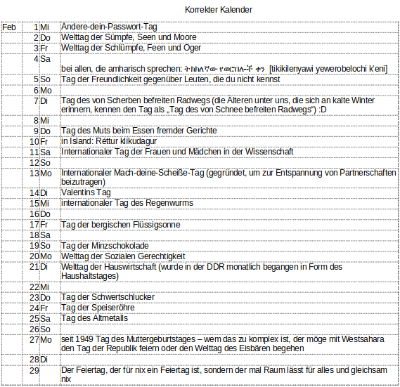 Welcher Feiertag vom 23.-25.2. echt und welcher ausgedacht ist, weiß ich leider nicht mehr. Sie könnten alle ausgedacht sein, ebenso könnten sie echt sein – es gibt so viele skurrile Feiertage! Deswegen hat das Jahr 2023 auch trotzdem den 29.2. im Kalender stehen. Allerdings ohne Wochentag. Nimm ihn dir einfach.
