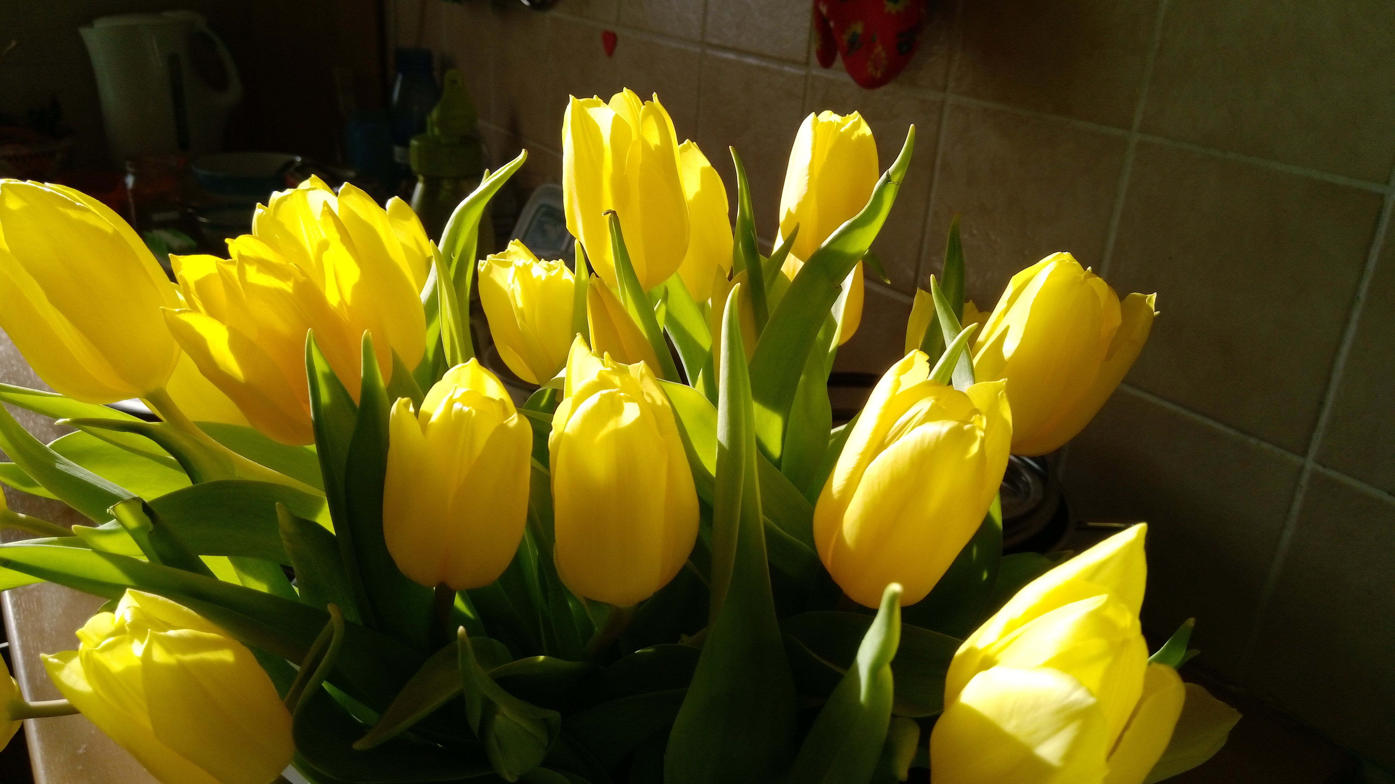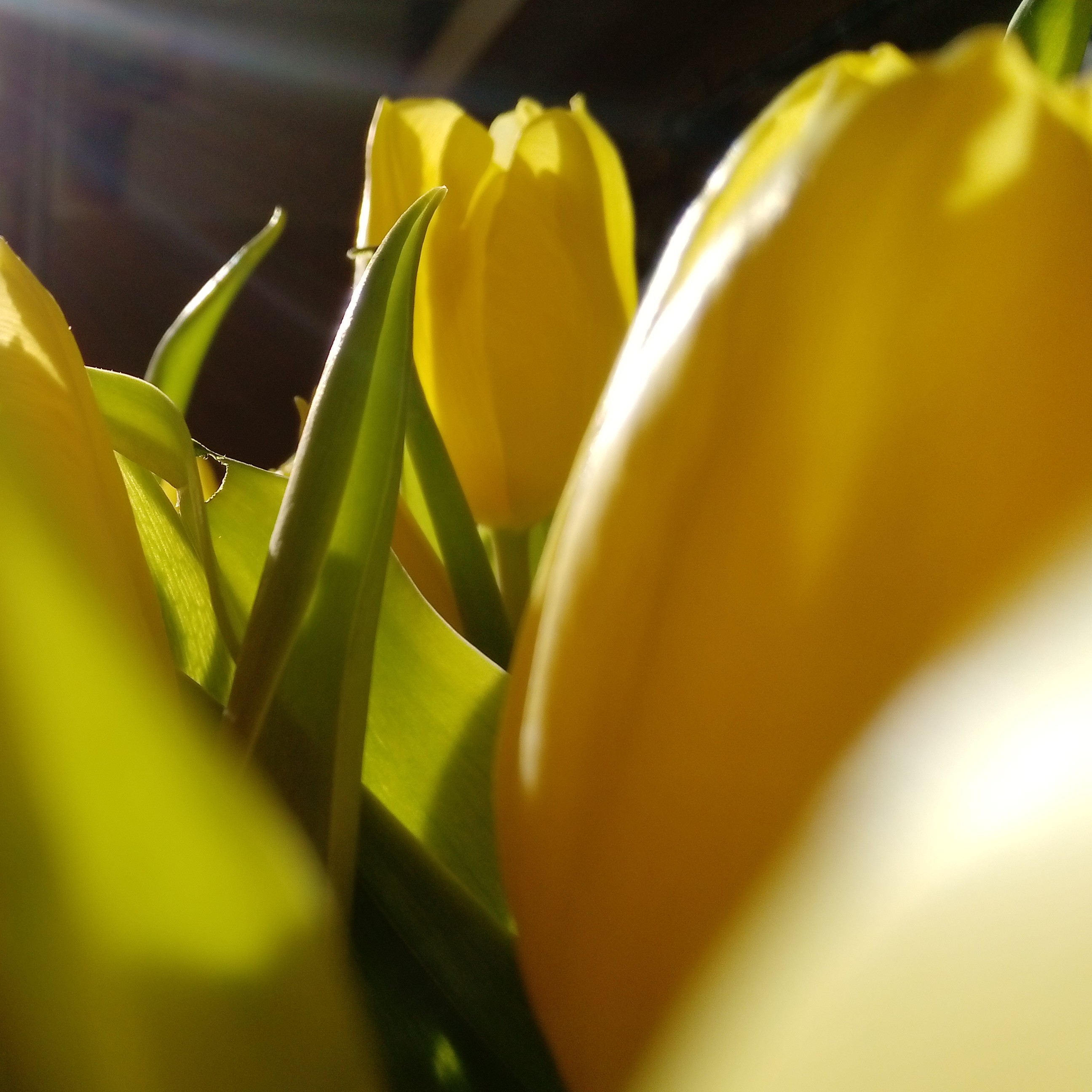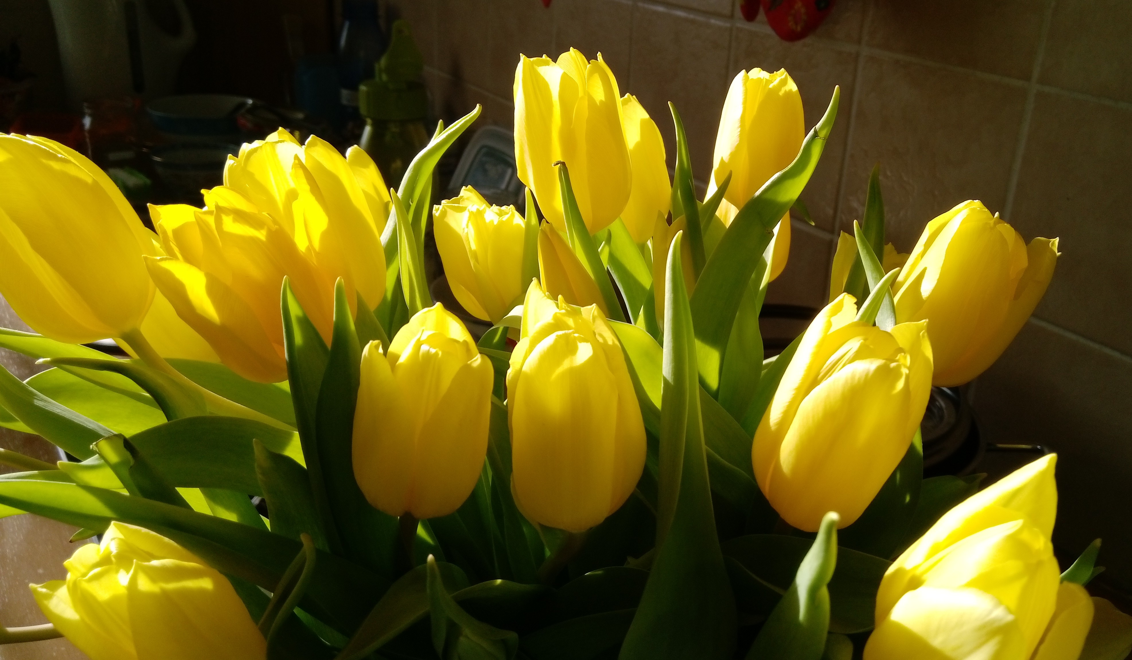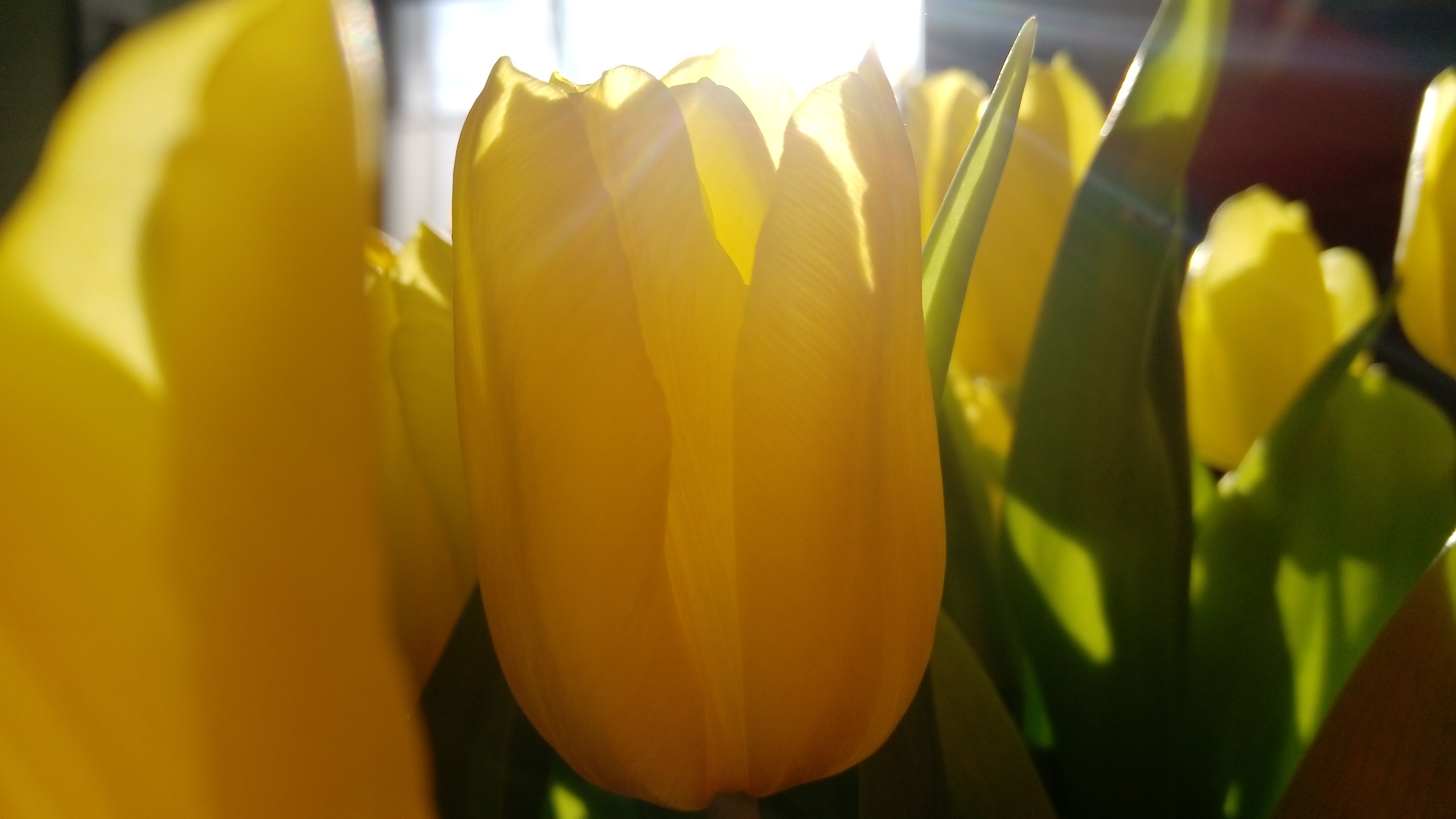 Inmitten der gelben Pracht steckt eine, die anders gelb ist als ihre Mittulpen. Das hab ich erst gestern bemerkt, als ich sie in meine große Vase steckte. Zuvor hatten sie den Kultshock verschönert.