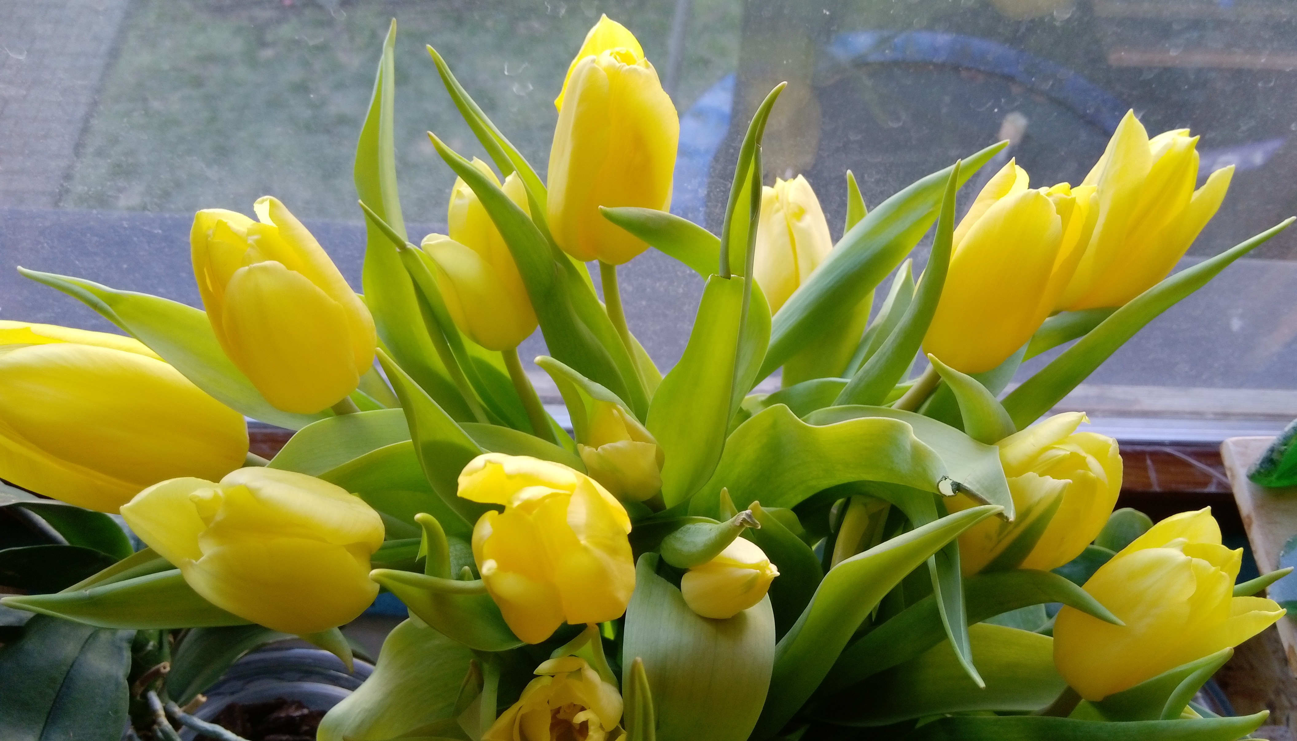 Hier zuhause ist das zum Glück anders, denn ich liebe die Tulpenzeit. Eigentlich sind vorher die Narzissen dran, aber es gab Freitag keine, so hab ich den farblichen Kompromiss gewählt.