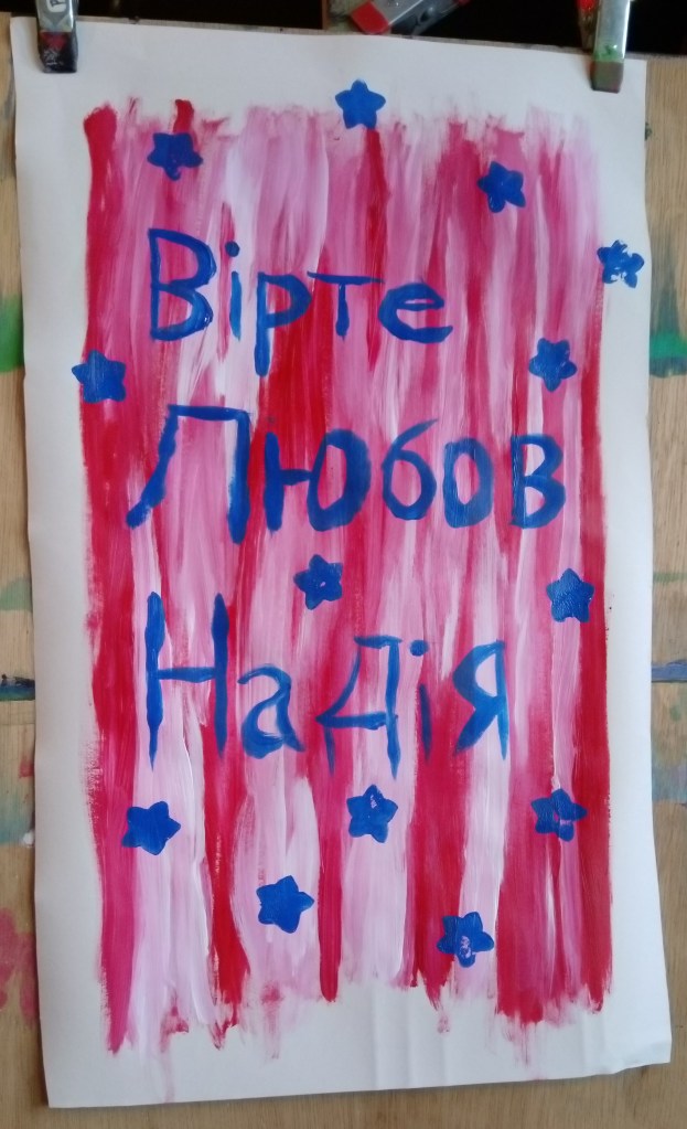 Dies war die prophetische Botschaft: Es ist absichtlich in den „Farben des Feindes“ gemalt (russische Flagge: 🇷🇺), denn auch dort gibt es gute Menschen. Segne deine Feinde! Die dreizehn Sterne bedeuten, dass die Ukraine in die EU kommen wird. Auf der EU-Flagge sind es zwölf.