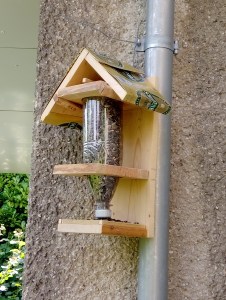 hier noch ein Foto vom neulich erwähnten Vogelfutterhaus mit der Flasche als Reservoir und der Bierdosendachdeckung. Kein Wunder, dass ich bei dem ganzen Bier ne Meise kriege!