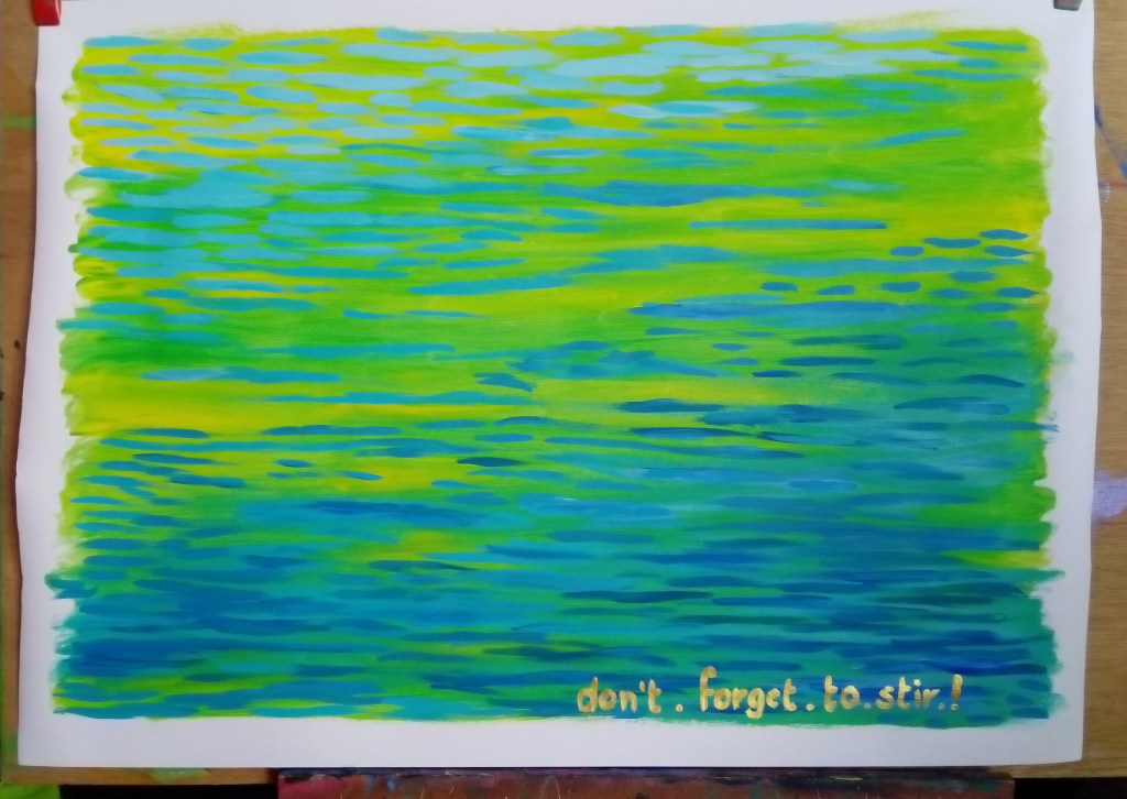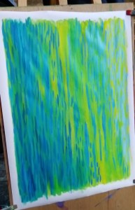 Dann habe ich angefangen, frühlingsgrün mit gelb und etwas türkis zu grundieren und dann die Strichlein in hellerem und dunklerem Türkis drüber. Da war es noch ein Hochformat: