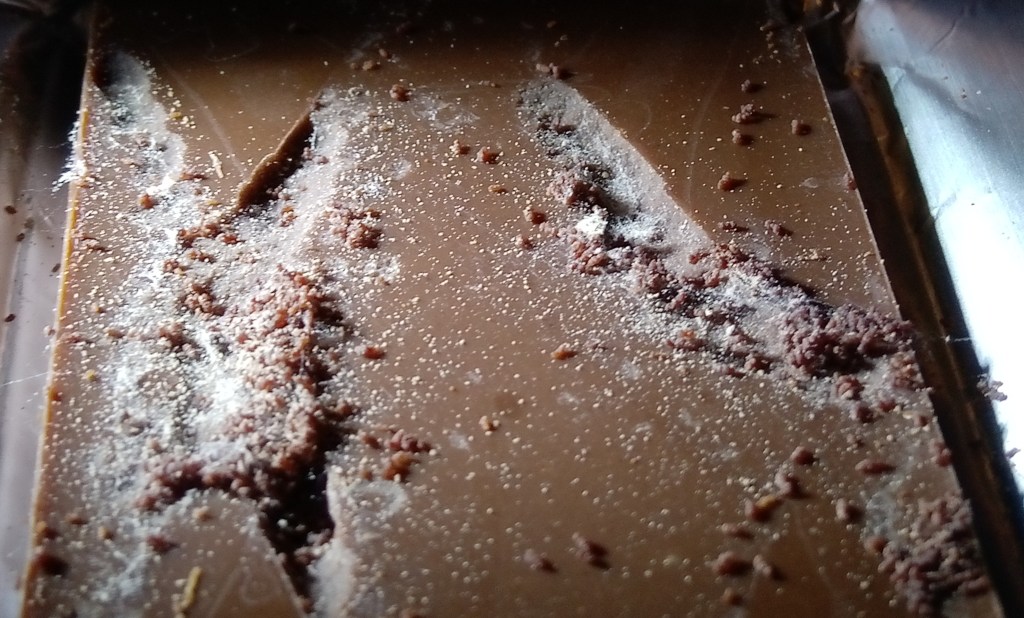 Aber ich sag dir, was ich tue: ich frier das alles ein und nach der Dauer einer kleinen Eiszeit wird ordentlich getrennt: Papier in den Papierkorb, Alu ins Alueimerchen, Krümmelchen und Gespinste und Verursacher in den Restmüll … oder in die braune Tonne, ich bin noch nicht sicher … und die Schokoladentäfelchen in mich.
