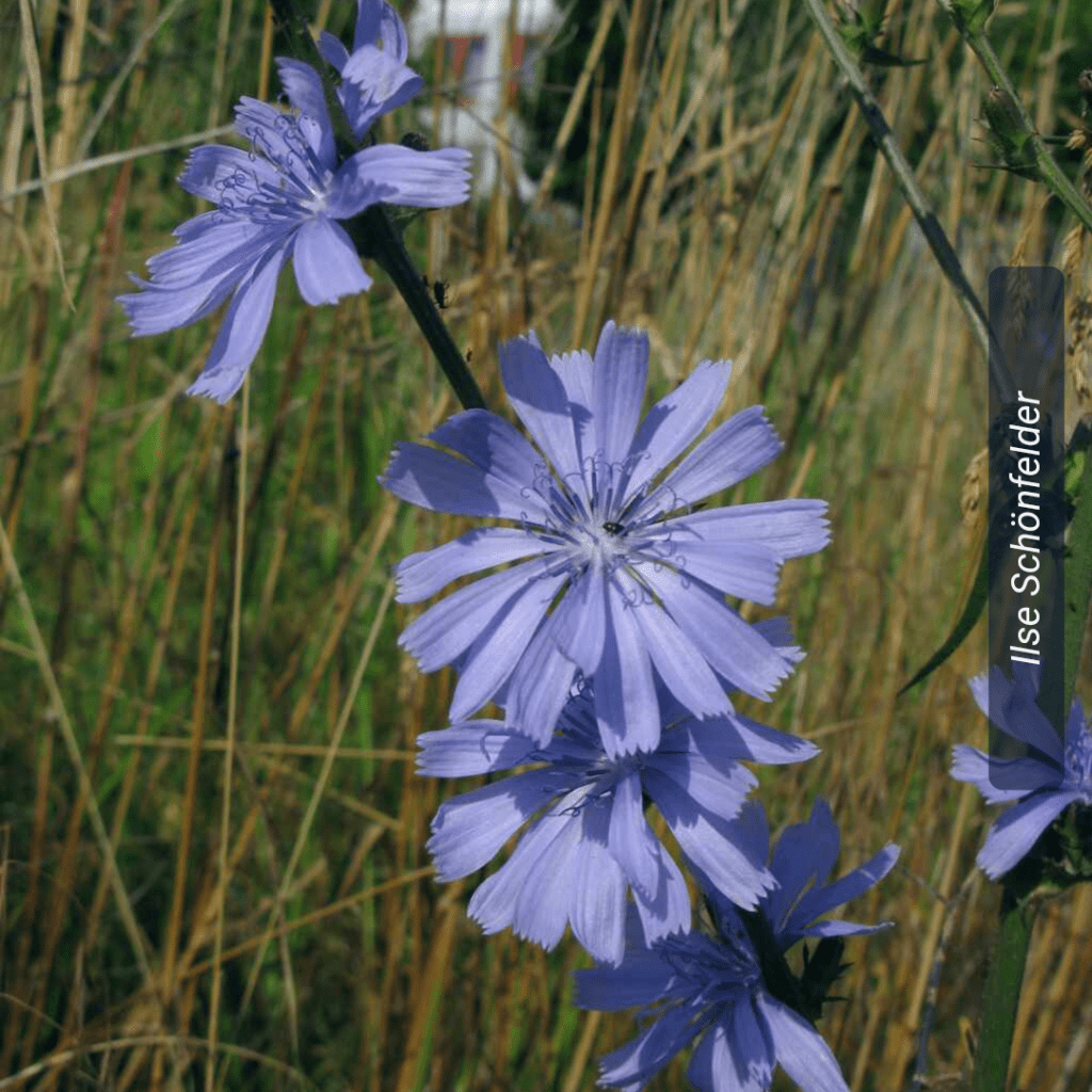 So sieht sie aus, die Gewöhnliche oder Gemeine Wegwarte (Cichorium intybus). Seit offiziell auf Insektenschutz geachtet wird, findet man sie zuhauf an Straßenrändern, auf Brachflächen und im naturnahen, insektenfreundlichen Privatgarten.