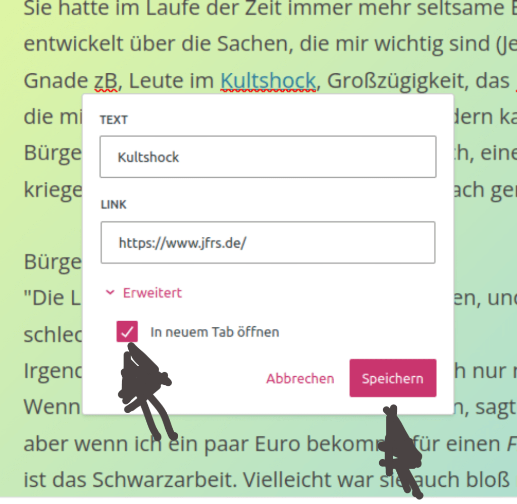 Wort bestimmen, Adresse einfügen, verknüpfen. Link noch mal anklicken-bearbeiten-erweitert-neuer Tab-speichern.