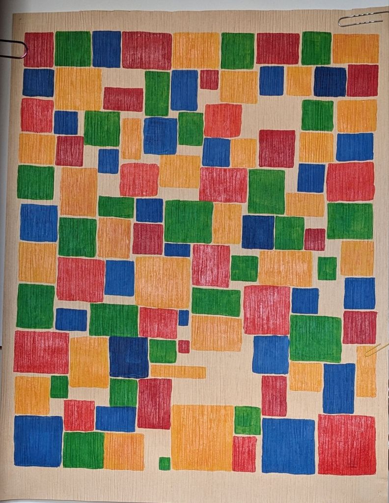 Papier ist nachgedunkelt, Farben leicht verblichen. Das weiße in den bunten Vierecken ist der Rest vom Tageslicht.