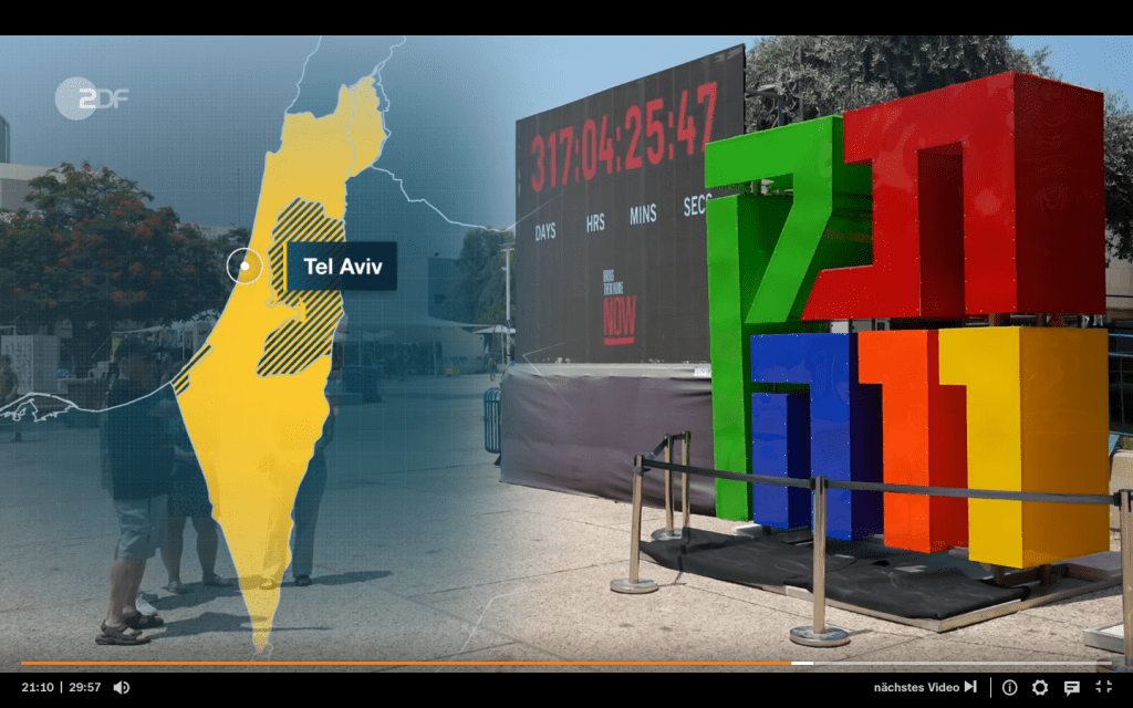 Der bunte Block rechts im Bild bedeutet „Hoffnung“ = Tikwa (so würde ich es aus dem Hebräischen transkribieren), die Tafel in der Mitte zeigt die Zeit an, die seit dem Angriff der Hamas auf Israel vergangen ist. Rechts ist die politische Karte von Israel, dem Westjordanland und Gaza (beides schraffiert)