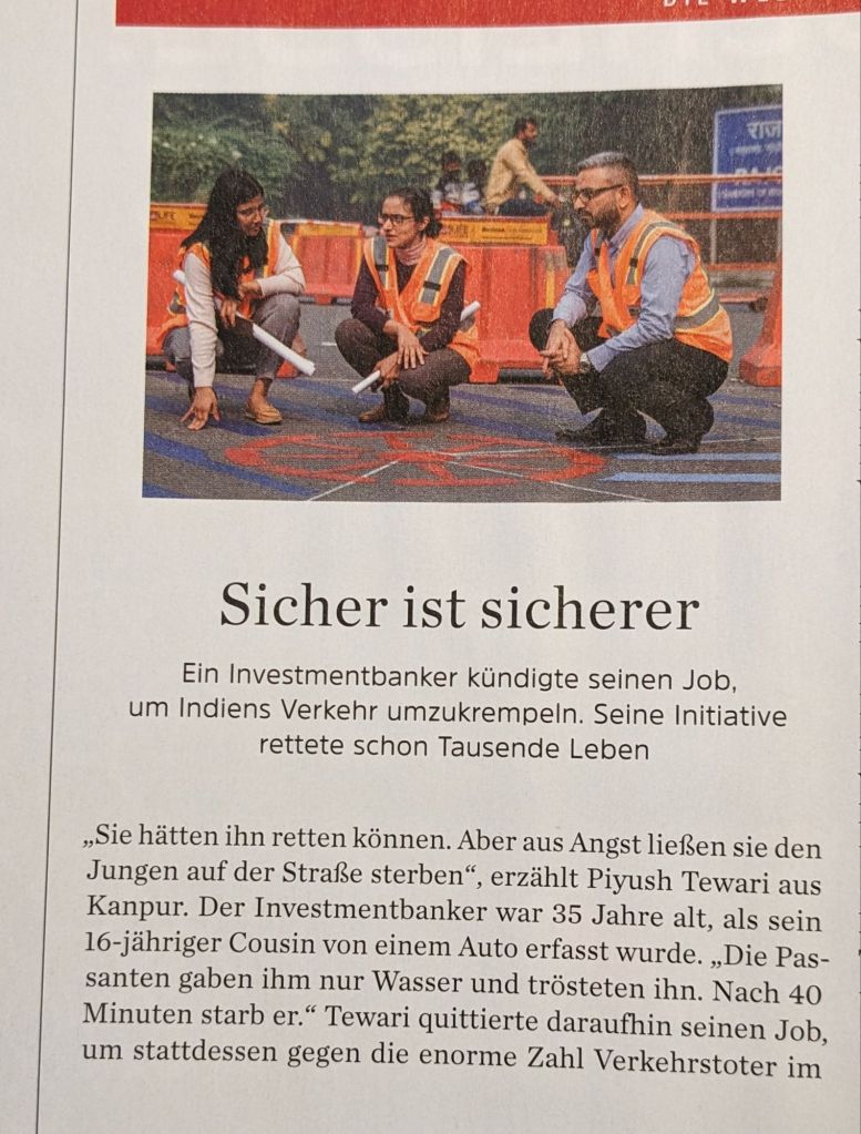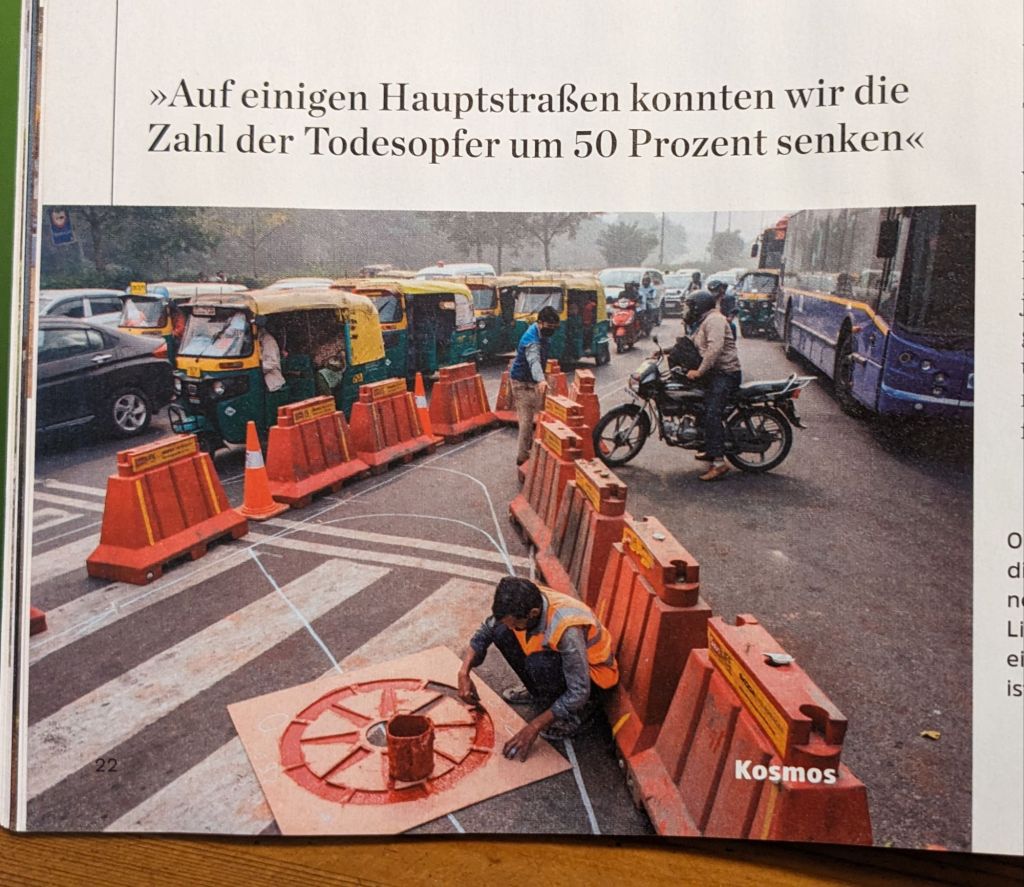 Oberes Bild: Piyush Tewari diskutiert mit Kolleginnen neue Fahrbahnmarkierungen.