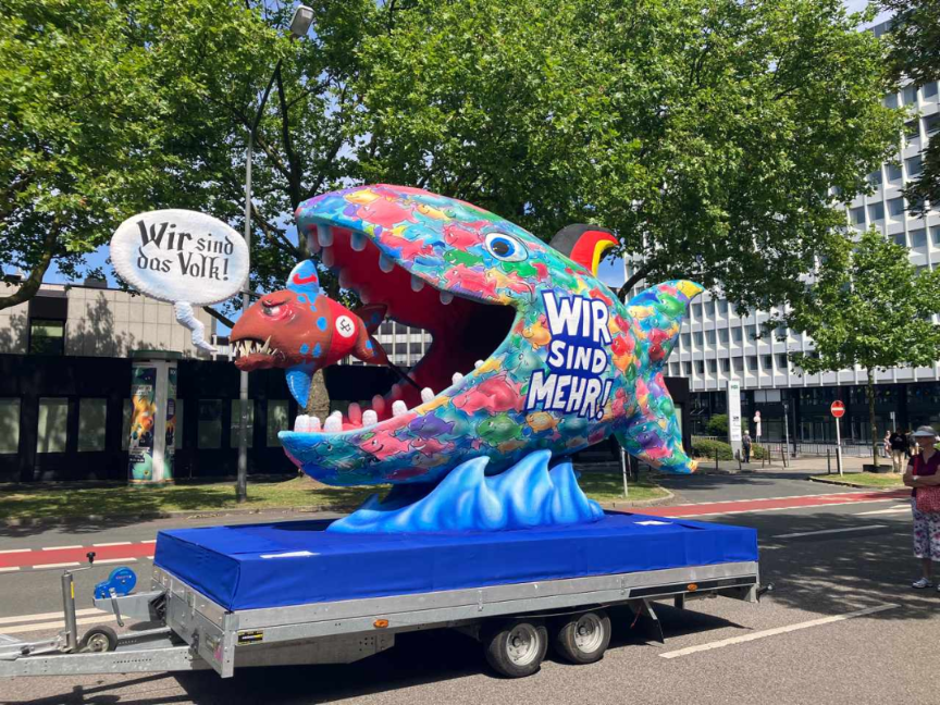 - Fotos „Russen gegen afd“ und der bunte Fisch: mit Erlaubnis der Fotografin (die untere Zeile auf dem schwarzen Banner lautet: „für uns keine Alternative“)