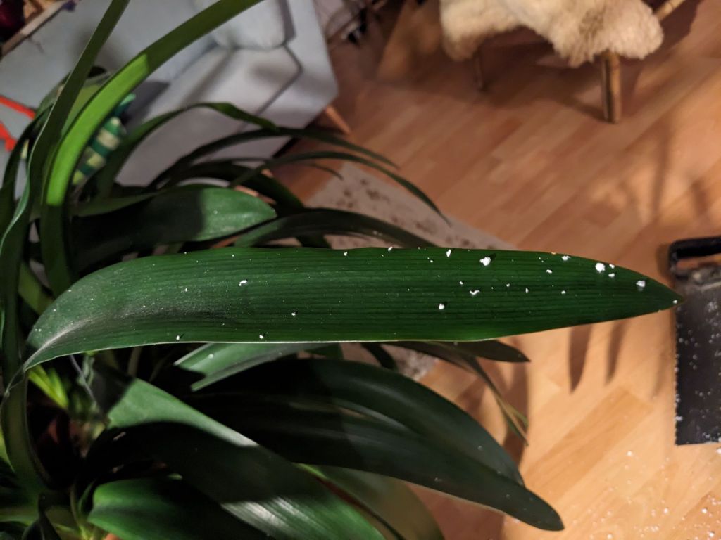 Nanu, sind das Schneeflocken, die sich so dekorativ auf den Blättern der Clivia niedergelassen haben? Nein, sind sie nicht. Der Kunstschnee ist Styropor, und er liegt nicht nur auf den Blättern der Clivia, sondern auch auf denen der Spatiphyllum (die aufmerksame Leserin¹ weiß: die zwei Grünlinge sind Nachbarn im heimischen Wohnzimmer) …