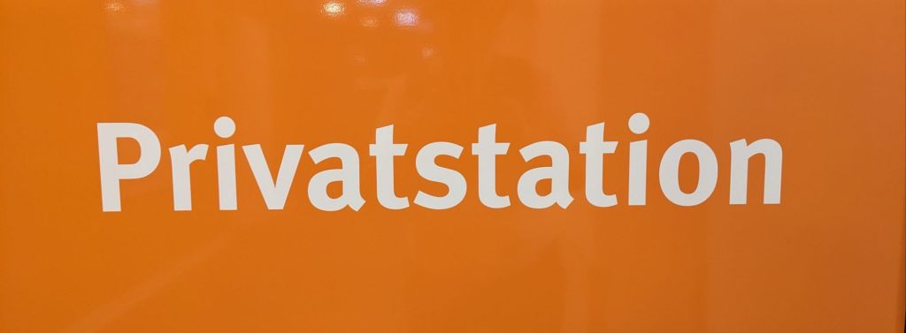 … ich bin letztes Jahr im Krankenhaus sehr zu oft an diesem Schild vorbei gekommen, und du weißt ja, was Buchstaben mit mir machen: ich muss sie immerzu lesen, aber sie regen auch meine Fantasie an, und dann trenne absichtlich falsch, verbinde die Einzelteile neu, 🎩, ſ, ☂️ und vorwärts-rückwärts-seitwärts-rein, Hacke-Spitze-hochdasBein!