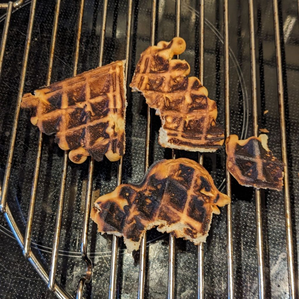 Einmal nicht aufgepasst beim Waffelnbacken für Mutterns Jebotzdach, mit der jüngsten meiner vier großartigen Nichten aufm Hocker zwischen mir und der Arbeitsplatte, (sie die Kelle für den Teig in der Hand, ich das Gäbelchen, um die fertigen Waffeln rauszuprakesieren*¹, und außerdem die Teigschüssel und nen Lappen, damit die Kleckerei sich irgendwie in Grenzen hält), weil wir uns gegenseitig darauf hinweisen mussten, dass das Waffeleisen sehr heiß ist, aber man es am Griff aufmachen kann, muss man ja, weil sonst die Waffel ganz schwarz wird – – –