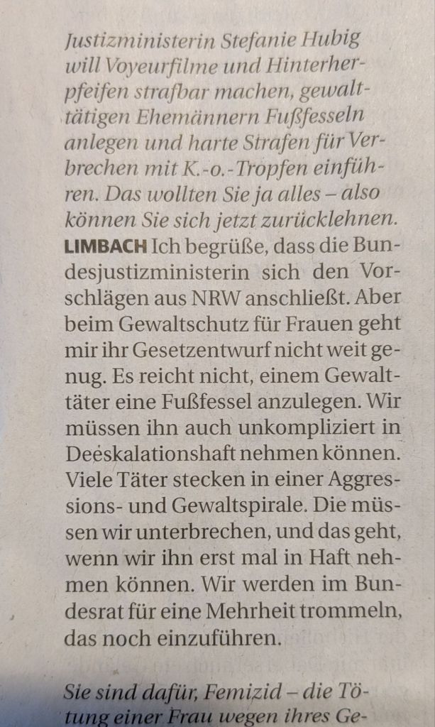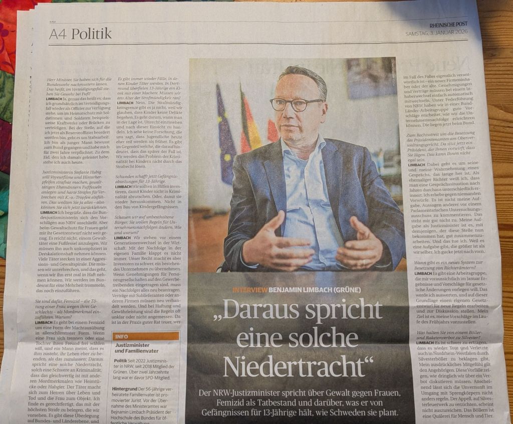 Am 3.1. veröffentlichte die Rheinische Post ein Interview mit NRW-Justizminister Limbach (Grüne), das uns Frauen positiv stimmen könnte …