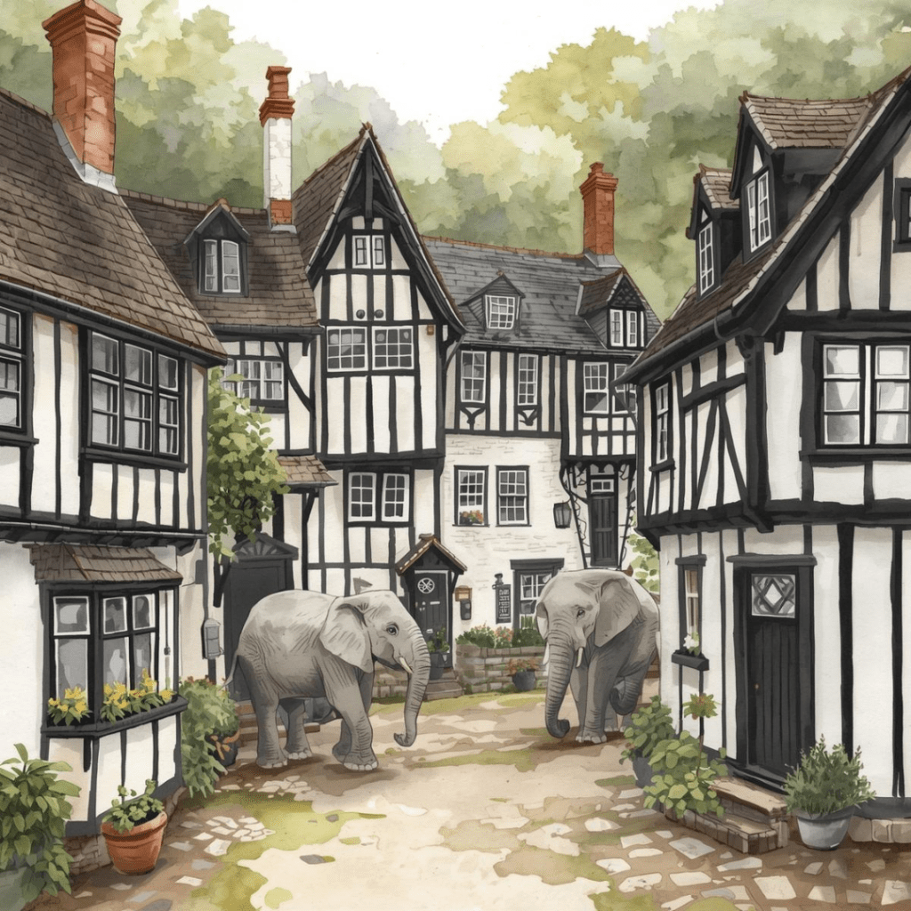 ² die schönen Bilder hat mir übrigens eine KI gemacht. Nach anfänglichen Schwierigkeiten wurde die Verständigung immer besser. Seltsam nur, dass in der Fachwerkromantik der Elefant rechts zwei Rüssel anstatt vier Beinen hat – was solls, KI lügt halt bei jedem vierten … Bein.