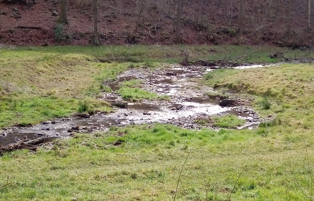 Dieser linke Zufluss des Eschbachs unterhalb der gleichnamigen Talsperre ist nach dem Hochwasser von Juli 2021 nicht wieder „ordentlich“ gemacht, d.h. in den Zustand von vor dem Starkregen versetzt worden. Seitdem darf er tun, wonach ihm ist, und der Landwirt, der die Wiese nutzt, mäht drumherum oder lässt Vieh darauf grasen.