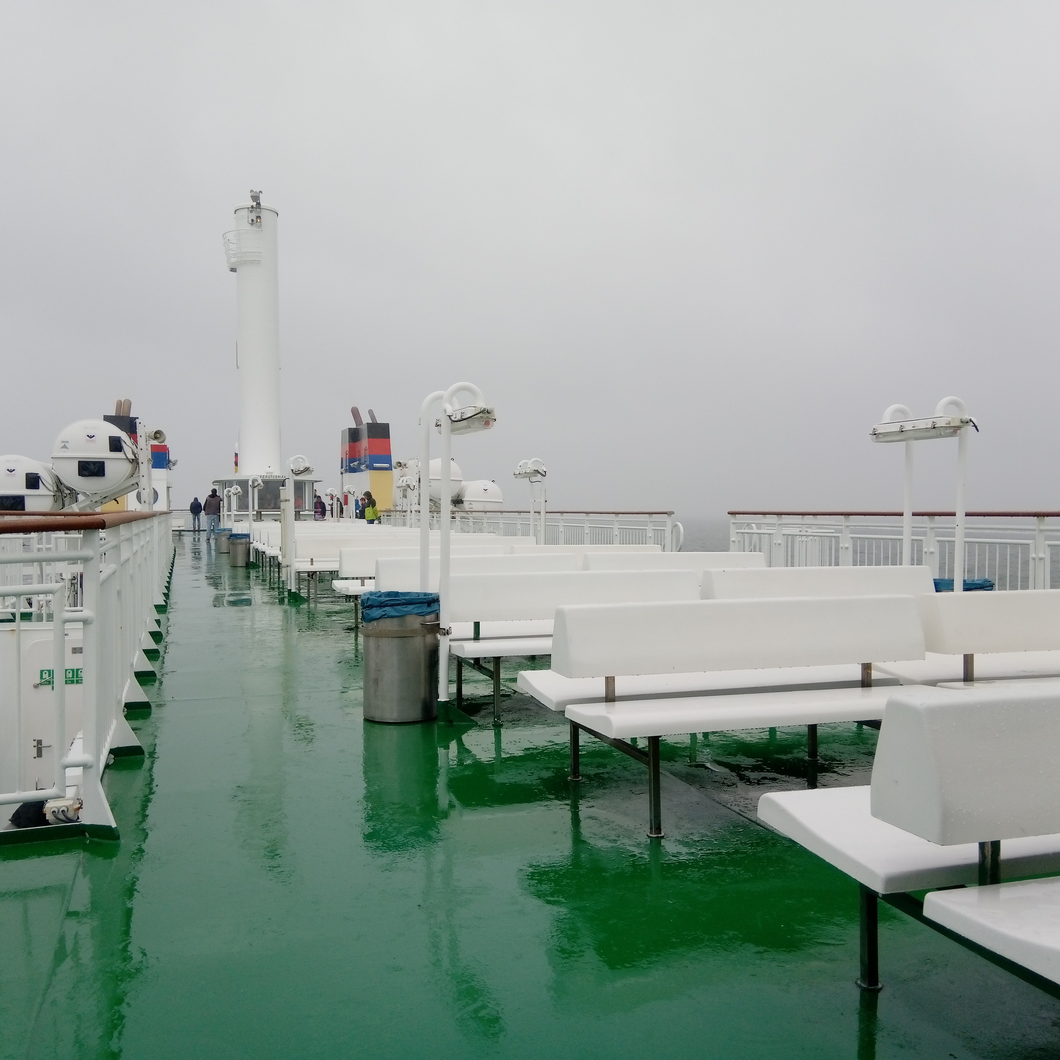- es war ein Sauwetter bei der Überfahrt. Obwohl die Fähre rappelvoll war (der 🐱maran war ausgefallen), bot sich den Frischluftfreunden auf dem Oberdeck sehr viel Platz.