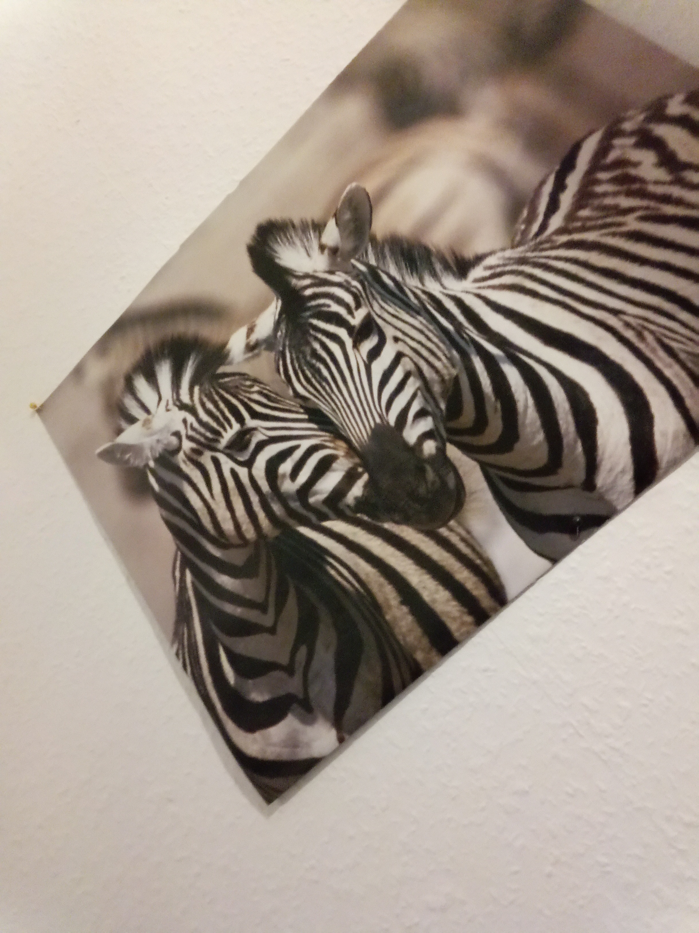 Und ein paar sind Fotos, wie zB die 🦓🦓. Die hängen schon seit etlichen Adressen in meiner Küche, allerdings rechtwinklig/parallel zu Decke und Zimmerecke. Es würden ihnen ja sonst alle Streifen verrutschen.