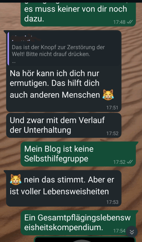 Das Stück Unterhaltung von 17:51 ist ein bisschen kuddelmuddelig, vermutlich wurde er abgelenkt in dem kleinen Zeitfenschterle zwischen schreiben und schicken oder die Bahn fuhr über eine harte Weiche oder so