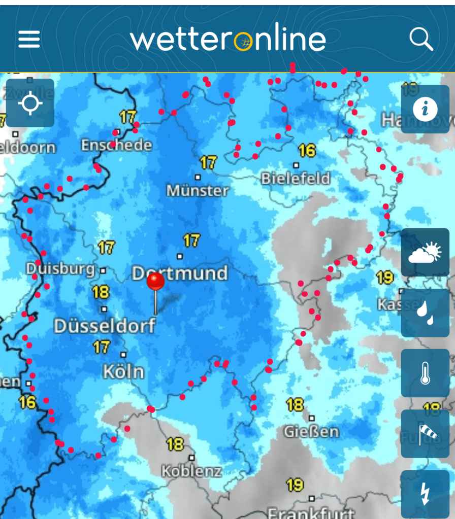 NRW hat die Landesfarben 🟩⬜🟥, aber heute könnte man annehmen, es sei blau (siehe Karte). Meine hauptamtliche Telefonjokerin T. behauptet, ich hätte solches Wetter mal als „Restbestände von Aprilwetter“ bezeichnet – möglich. Jedenfalls ist es definitiv kein Schauermärchen!
