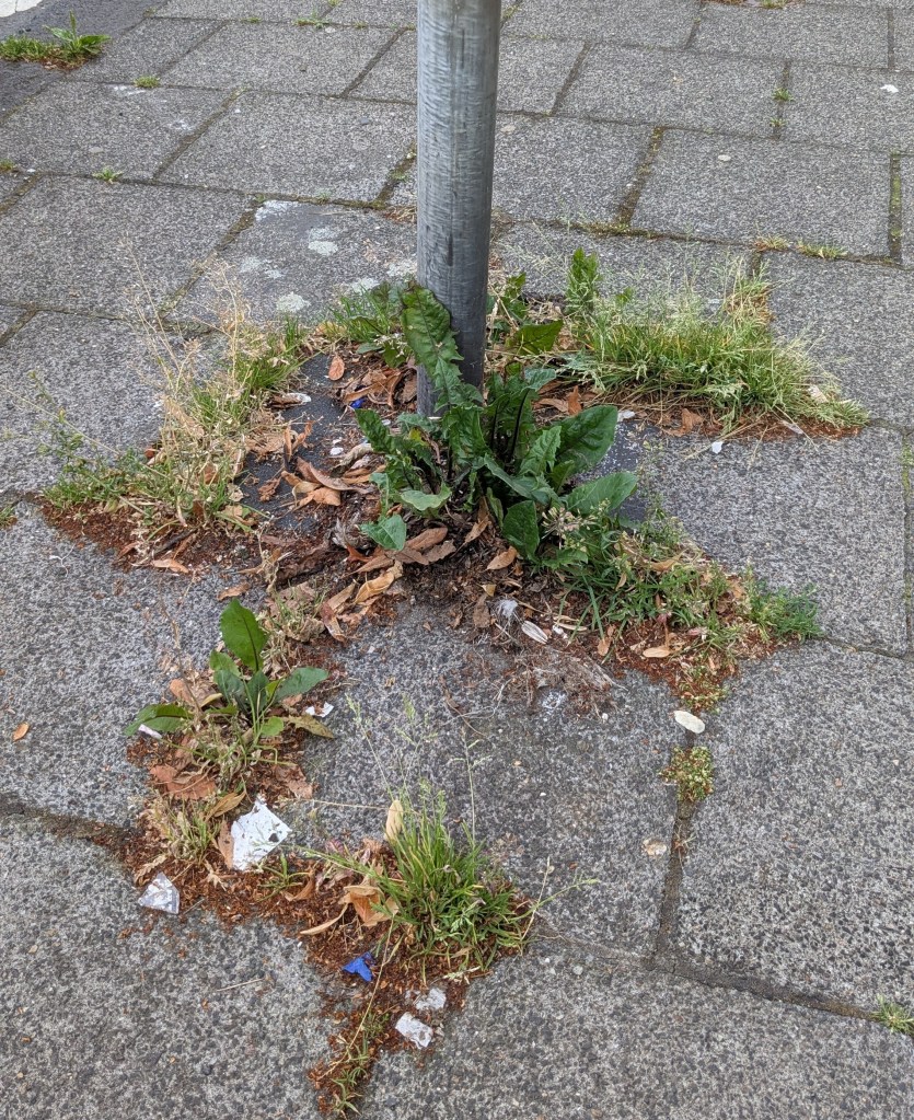 An all diesen kleinen Stellen könnte die Versiegelung mit wenig Aufwand aufgebrochen bzw. zurückgebaut werden, Regenwasser versickert besser, die Wildkräuter senken die Temperaturen direkt am Boden und die Artenvielfalt wird geschützt.