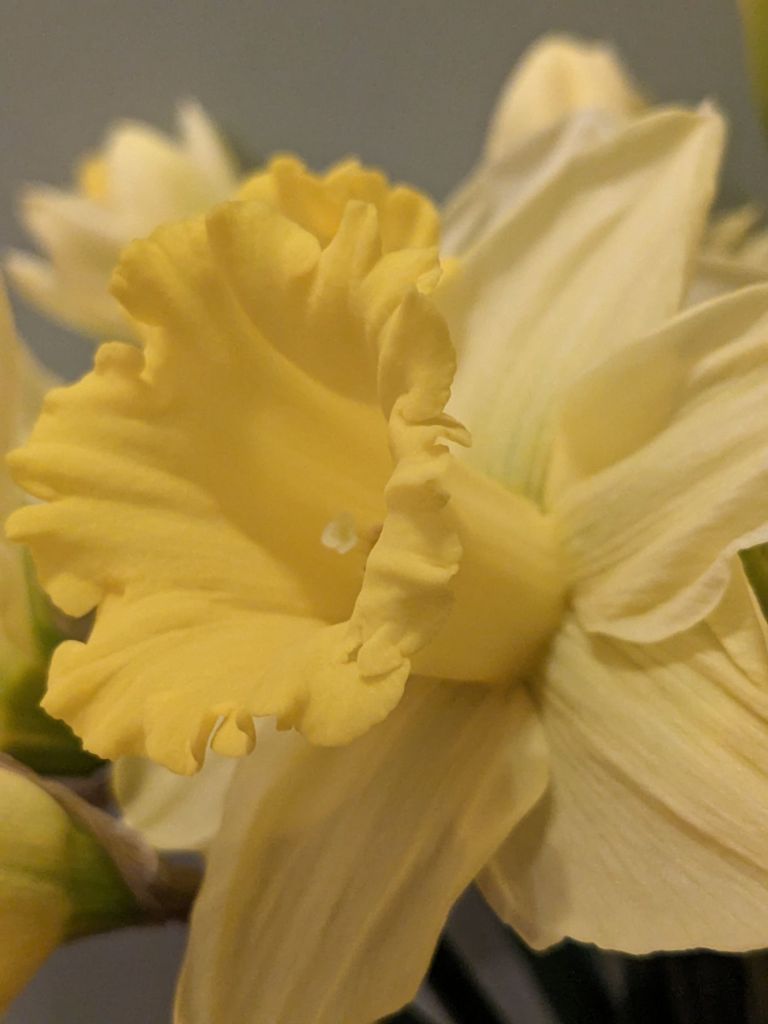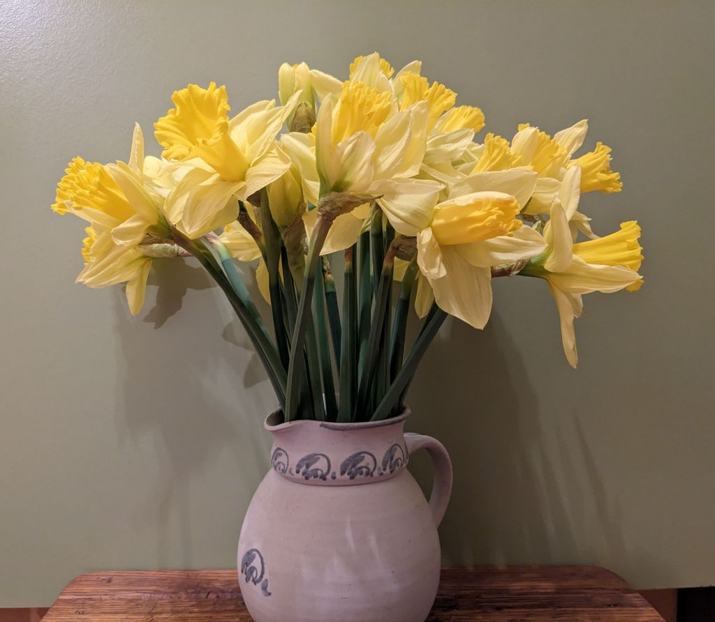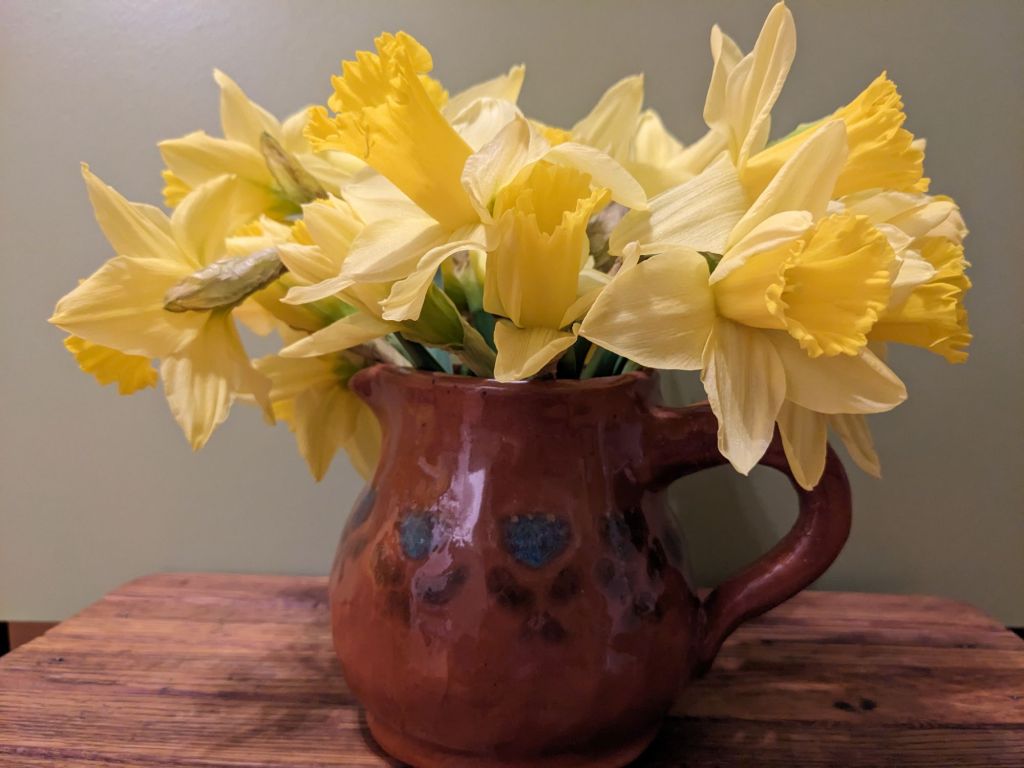Die kurzen Narzissen hab ich vielleicht ein klitzekleines Bisschen zu kurz geschnitten … aber sie wachsen ja immer noch etwas in der Vase – erst recht, wenn die ein höchstselbst getöpferter Krug ist!