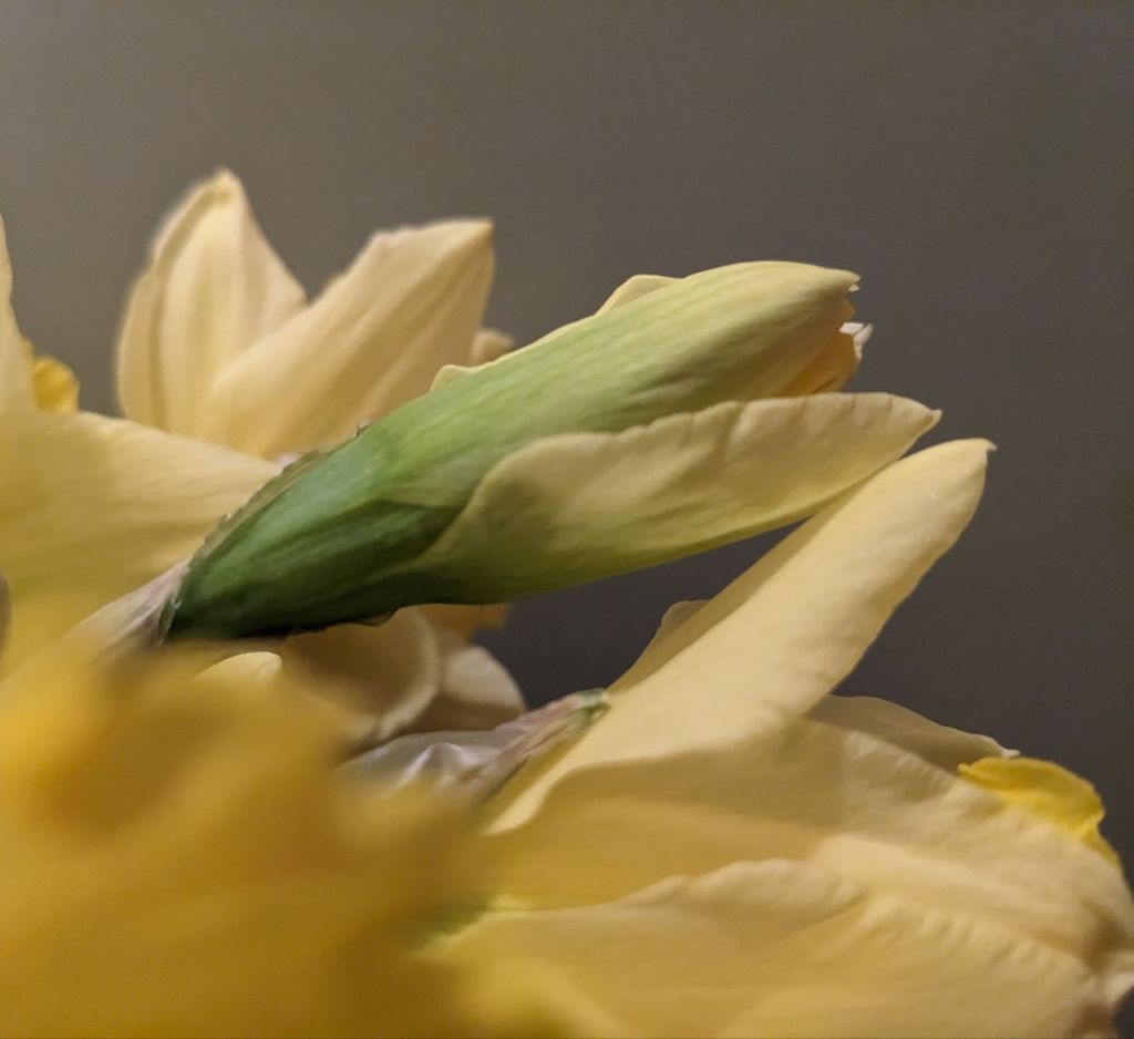 Die zwei Sträuße Narzissen sind bisher die Einzigen, die nicht vor unserer gelben Wand stehen möchten zum Fototermin. Sie bevorzugen die Küchenschranktür im Original-70er-Farbton „mangogrün“ als Hintergrunz. Sollnse! Hier darf sich jeder was wünschen.